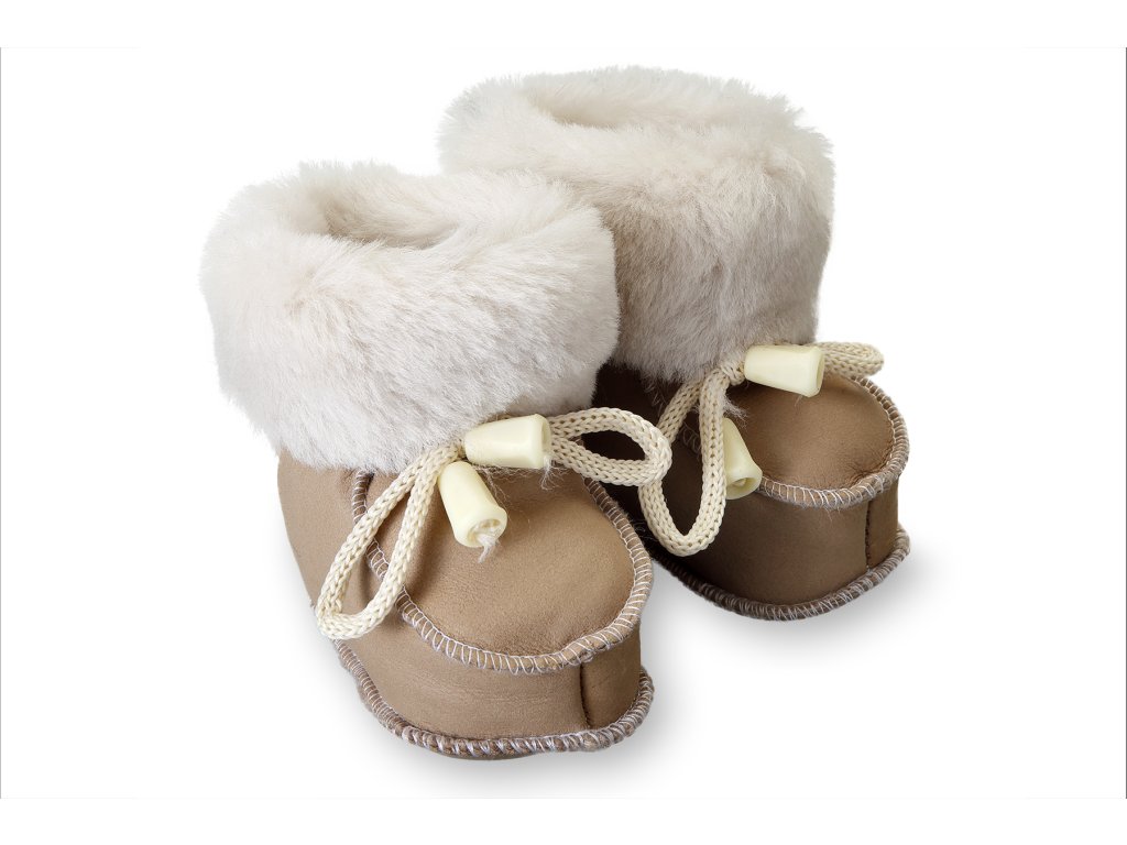 Material: strat exterior 100% piele de oaie / strat interior piele de oaie / talpă piele de oaie; Culoare: maro deschis; Dimensiuni disponibile: 10 cm, 10,5 cm, 11,5 cm - mărimea pantofului interior