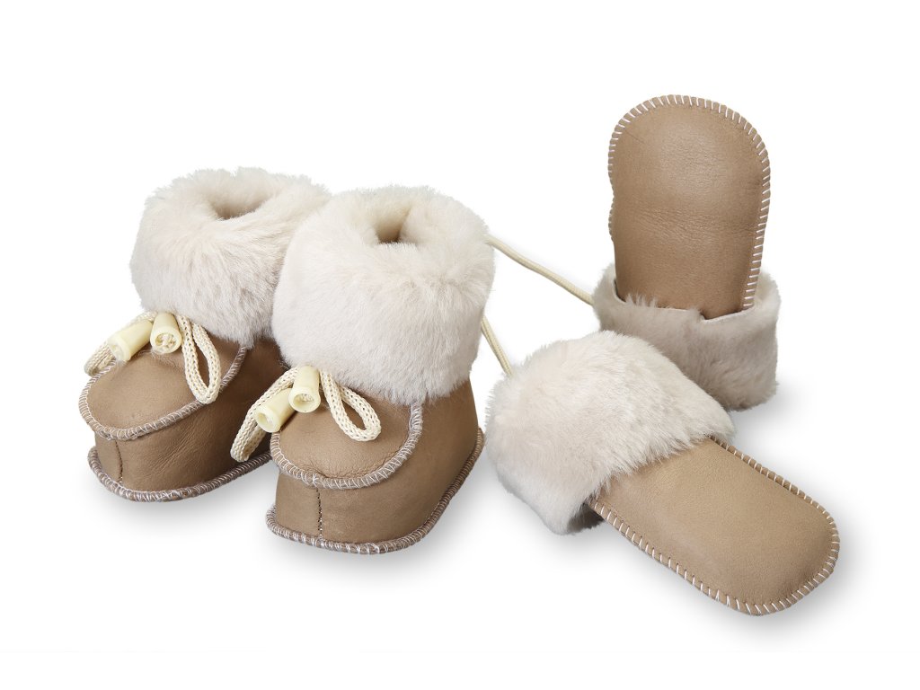 Set din piele pentru copii - mănuși și botoșei - fabricate exclusiv din materiale naturale. Pentru fabricarea încălțămintei s-a utilizat piele naturală, care este extrem de delicată cu piciorușele celor mici. Vopsită este doar partea exterioară. Botoșeii din piele pentru copii oferă căldură plăcută și protecție împotriva supraîncălzirii pielii delicate și sensibile a copiilor. Încălțămintea din piele pentru copii este mai potrivită pentru utilizarea în cărucior. Talpa interioară din blană de oaie garantează confort maxim și confort termic în timpul utilizării.