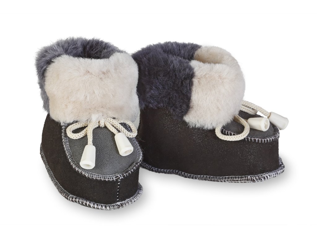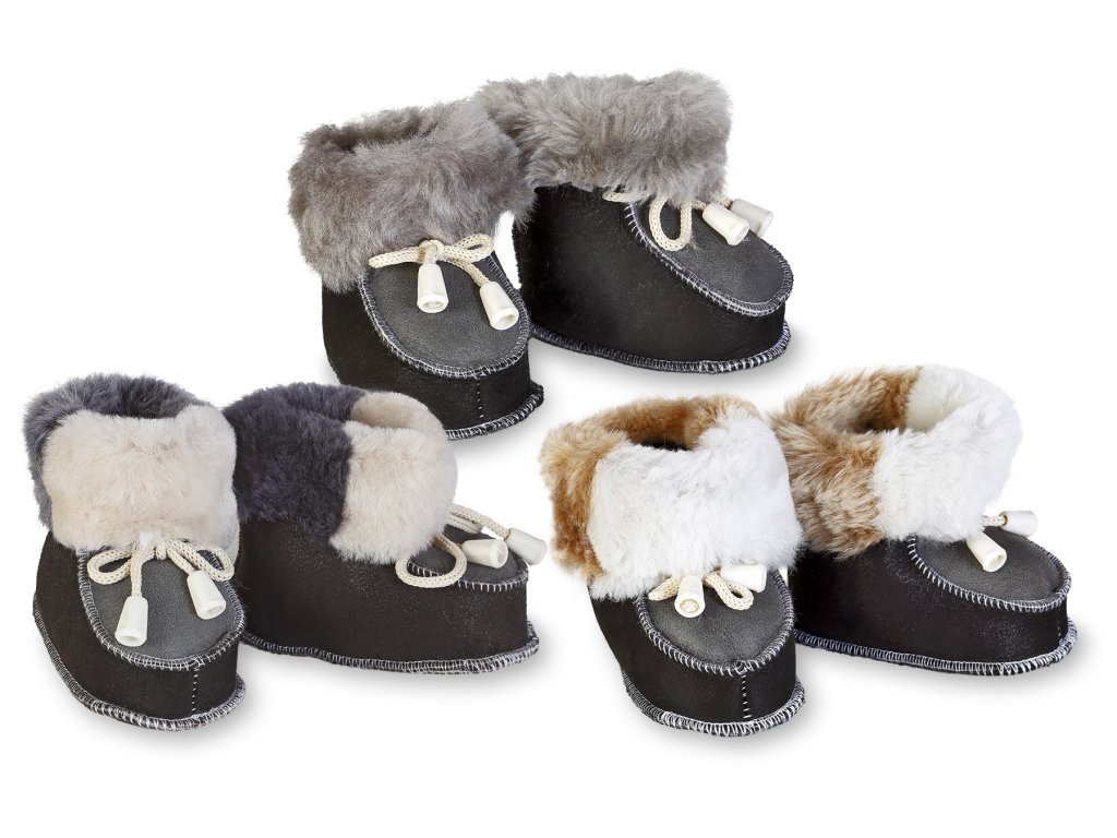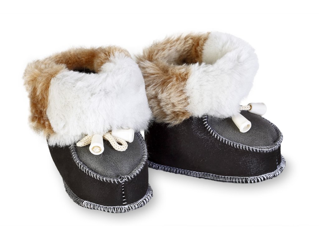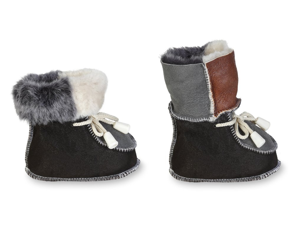 Botoșeii sunt realizați prin cusătura a două (uneori mai multe) tipuri de blană de oaie. Din acest motiv, botoșeii sunt o combinație de mai multe culori. Corpul botoșeiilor, pe partea exterioară, este întotdeauna o combinație de culori negru și gri. Nuanța exactă a culorii gri poate diferi de cea prezentată în fotografiile ilustrative ale produsului. Corpul botoșeilor, în partea superioară, este terminat cu un tiv, care poate fi îndoit. Tivul botoșeilor este din blană și poate fi realizat într-o singură culoare sau într-o combinație de mai multe culori. Botoșeii se pun pe piciorușele bebelușului și se fixează cu ajutorul a două șireturi.