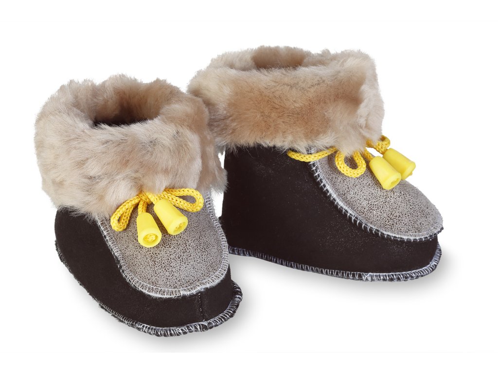 Material: strat exterior 100% piele de oaie/ strat interior blană de oaie / talpă din piele de oaie; Culoare: combinație de culori gri + negru; blana exterioară este diferită la fiecare produs; șnururi - albe / galbene / alte culori (în funcție de model); Mărimi disponibile: 10,5 cm, 11 cm, 11,5 cm, 12 cm - lungimea tălpii interioare a botoșelului