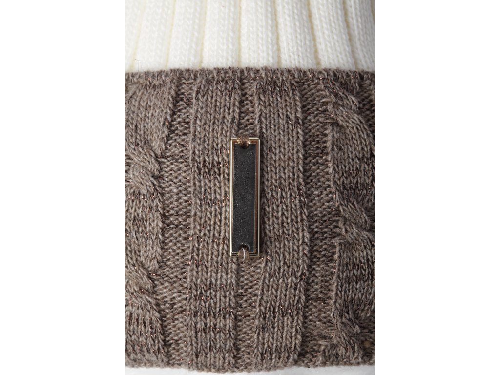 Căciuliță de iarnă de damă cu pompon în culoarea alb închis. Tivul exterior este realizat în maro cu un fir strălucitor. Această căciulă de iarnă moale și elastică vă va încânta cu senzația plăcută de căldură. Căciula nu strânge nicăieri și este moale la atingere atât la exterior, cât și la interior. Avantajul este că șapca poate fi spălată manual. Căptușeala interioară din fleece asigură un confort termic ridicat. Tivul dublu protejează fruntea, urechile și ceafa.