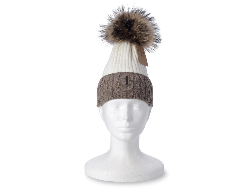 Căciulă de iarnă de lux pentru femei Sisi, alb crem cu tiv maro