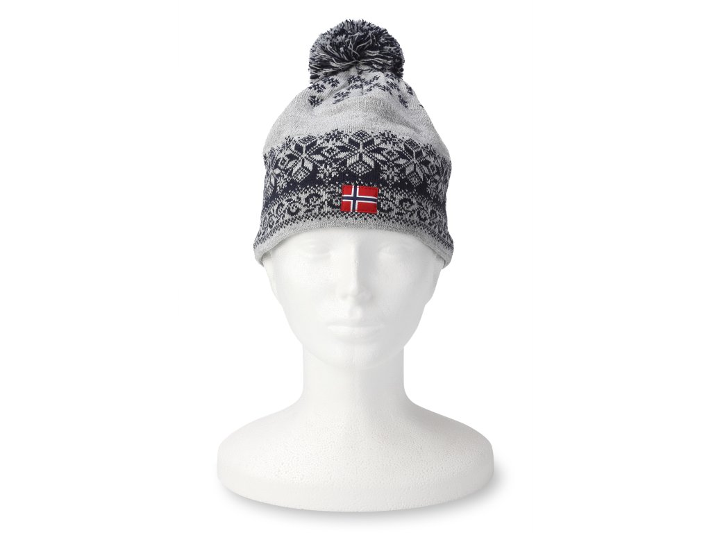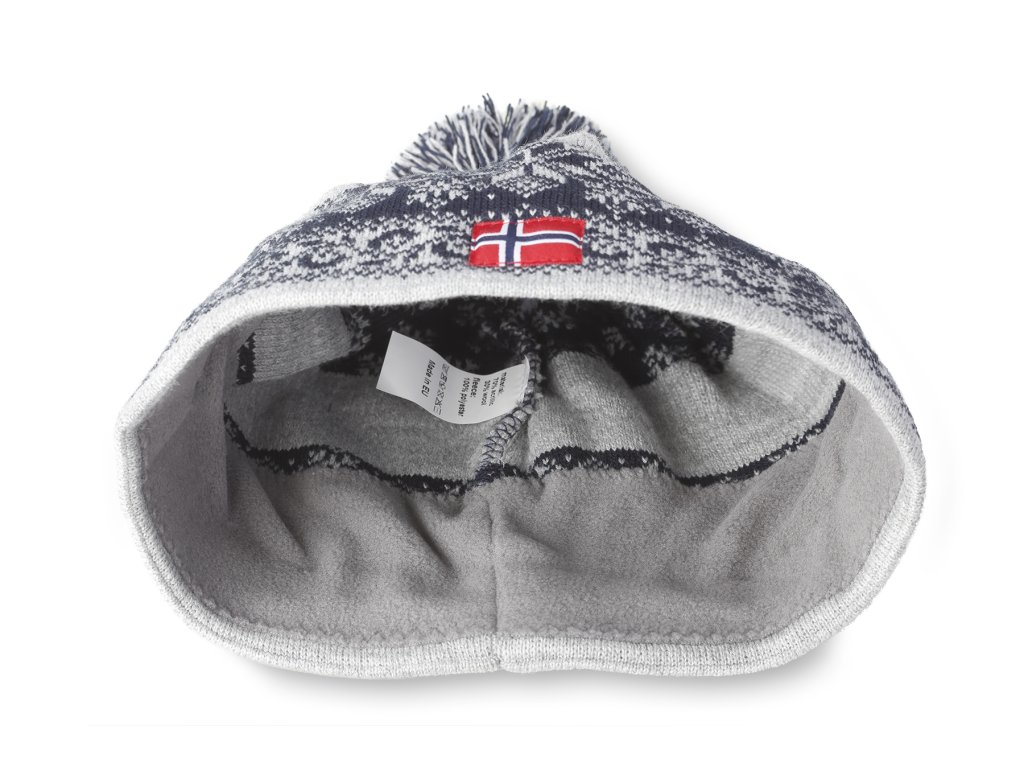 Căciuliță de iarnă caldă cu pompon, de culoare gri-albastru, cu motive norvegiene distinctive. Suprafața exterioară a căciulii din lână este tricotată la mașină. Această căciulă de iarnă are un tiv dublu în zona frunții, a urechilor și a cefei. Datorită acestui fapt, purtarea acestei căciuli este foarte confortabilă, deoarece tivul dublu asigură o căldură plăcută în aceste zone problematice, în special în perioada de iarnă. Tricotul interior este confecționat din fleece moale, foarte fin și cald la atingere.