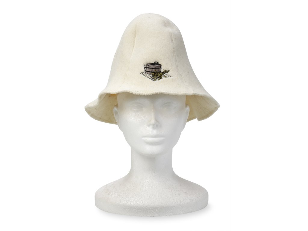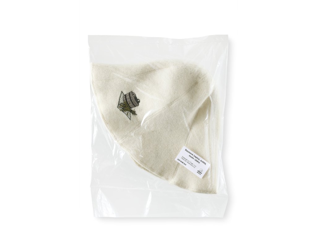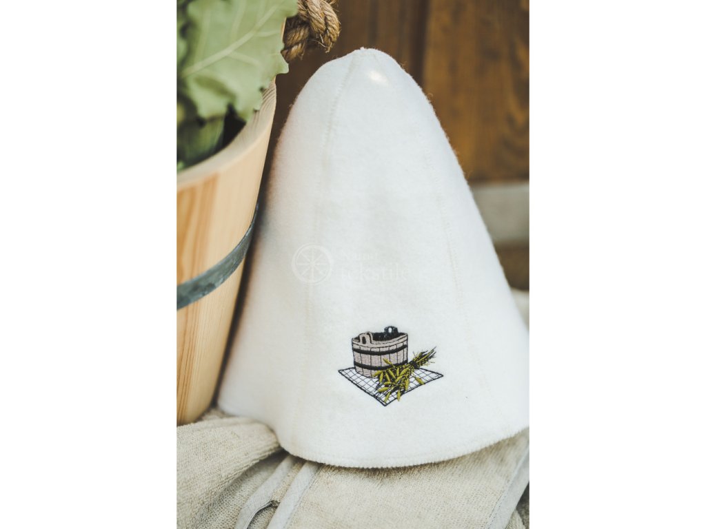 Căciula pentru saună este fabricată din 100% lână, disponibilă în culoarea crem deschis. Pălăria este brodată cu un motiv cu găleată și urechi pe partea din față. Căciulile din lână sunt destinate utilizării în saună. Datorită materialului utilizat, căciula este mai rigidă, mai rezistentă și mai durabilă. Tehnologia modernă permite apoi fabricarea unui material poros, „respirabil”, sintetic sau semisintetic.