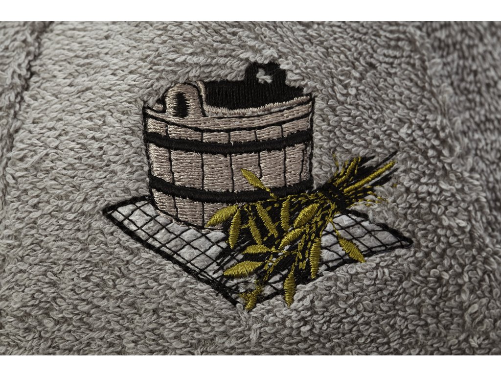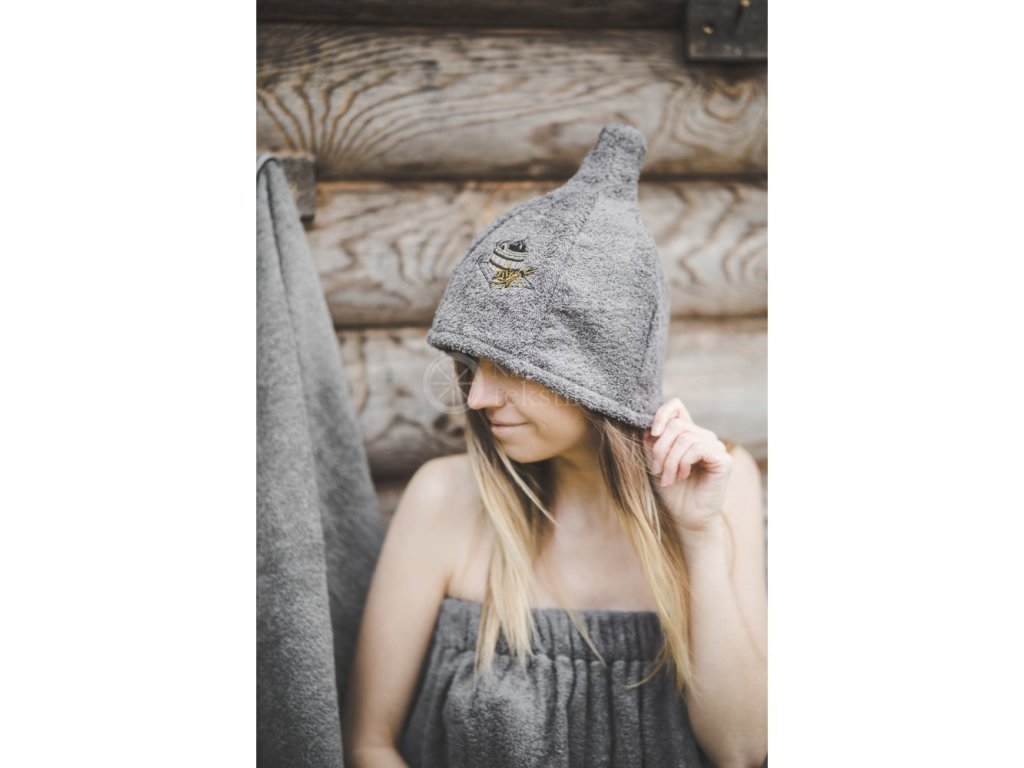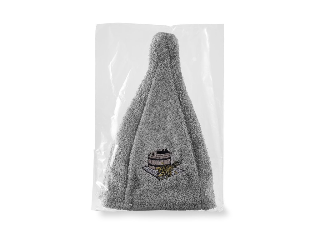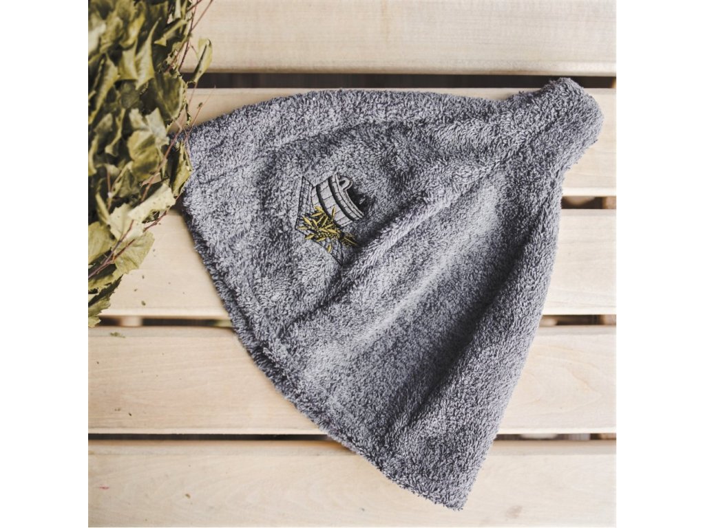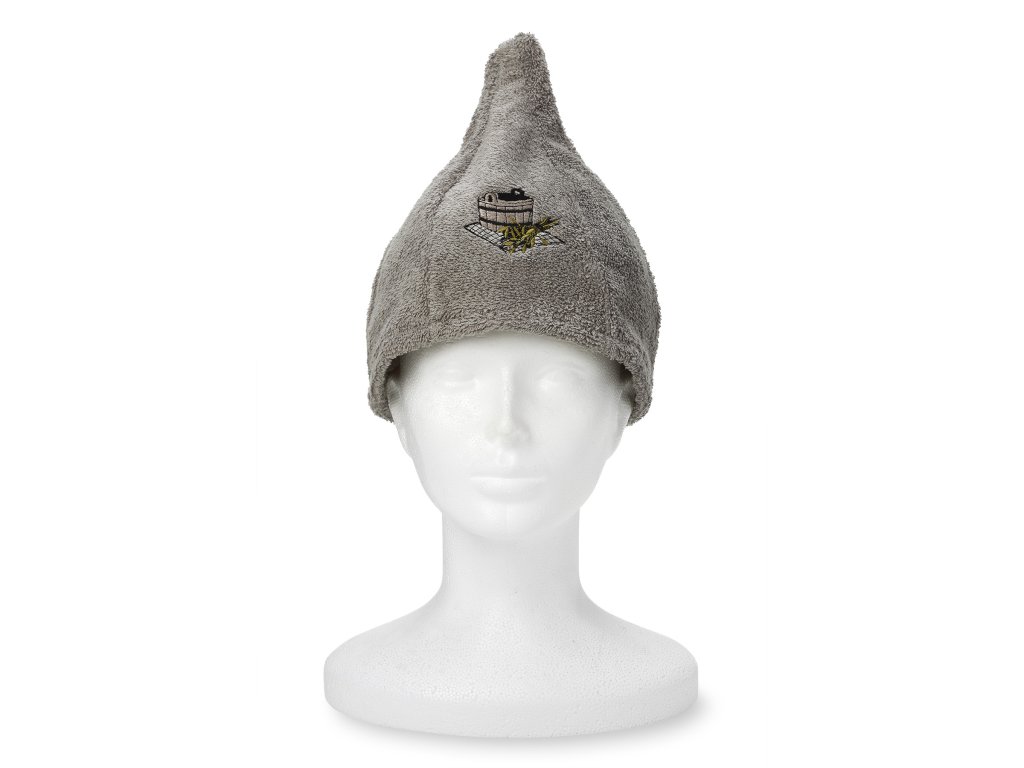 Căciula pentru saună este fabricată din 100% bumbac frotte, care este foarte fin și plăcut la atingere. Căciulile pentru saună sunt destinate utilizării în saună ca protecție a capului împotriva supraîncălzirii. Aceasta este funcția lor principală. Datorită materialului utilizat, căciula este mai rigidă, mai rezistentă și mai durabilă. Șapca de saună este de culoare gri, cu simbolul găleții brodat pe partea din față.