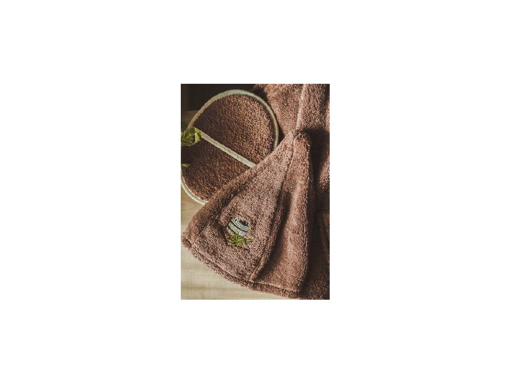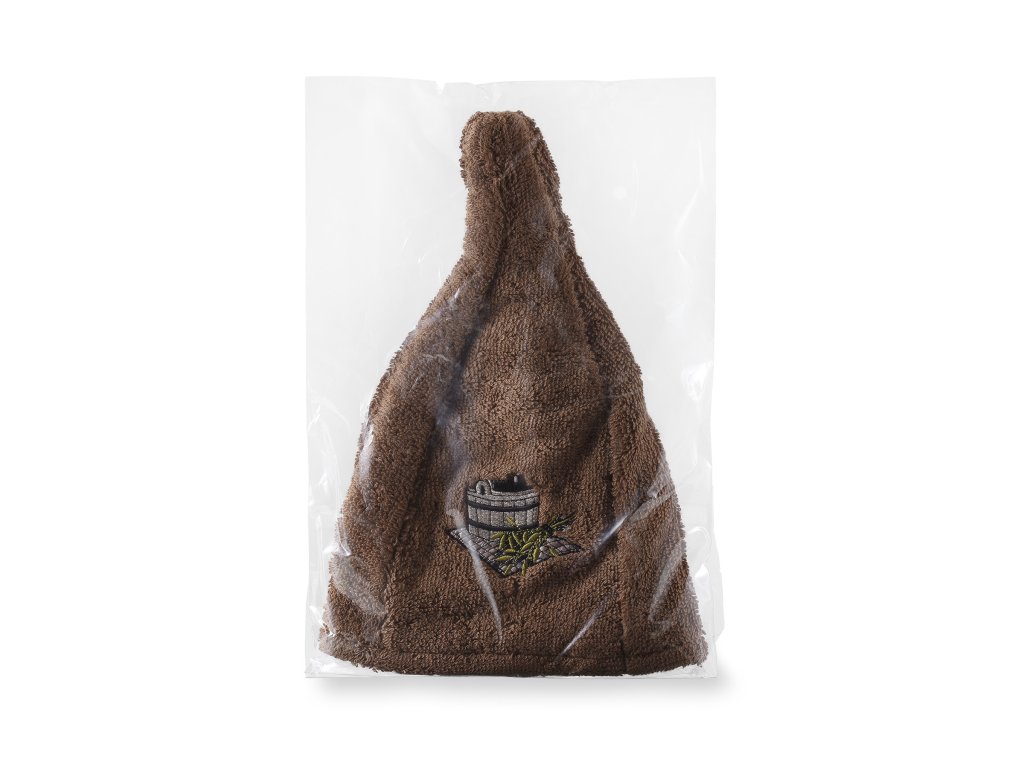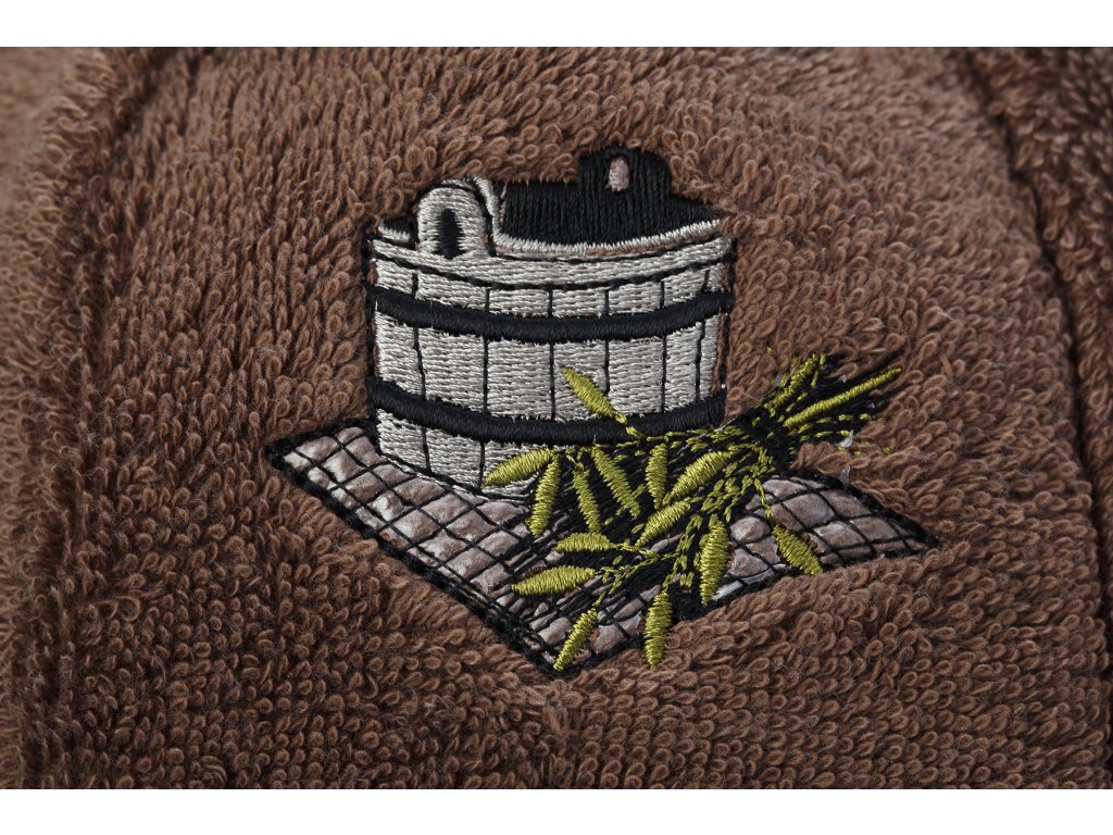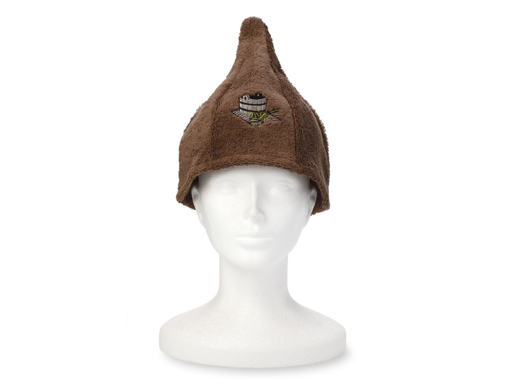 Căciula pentru saună este fabricată din 100% bumbac frotte, care este foarte fin și plăcut la atingere. Căciulile pentru saună sunt destinate utilizării în saună ca protecție a capului împotriva supraîncălzirii. Aceasta este funcția lor principală. Datorită materialului utilizat, căciula este mai rigidă, mai rezistentă și mai durabilă. Șapca de saună este de culoare maro închis, cu un simbol al găleții brodat pe față.