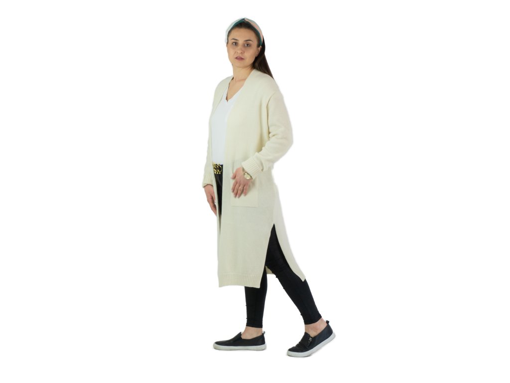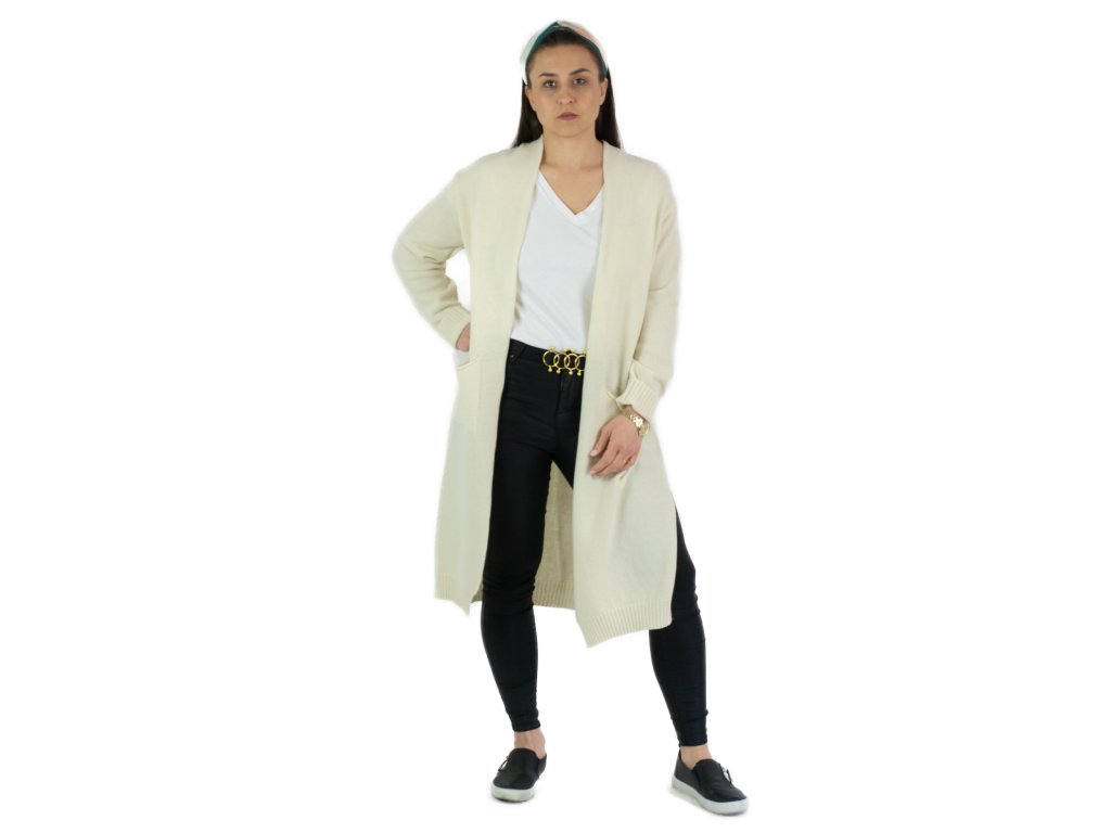 Cardigan pentru femei în crem deschis din lână de miel moale, cu mâneci lungi, cu croială dreaptă și fluidă. Lungimea cardiganului ajunge până la genunchi. Cardiganul nu are închidere, iar în zona inferioară are buzunare atât pe partea dreaptă, cât și pe partea stângă.