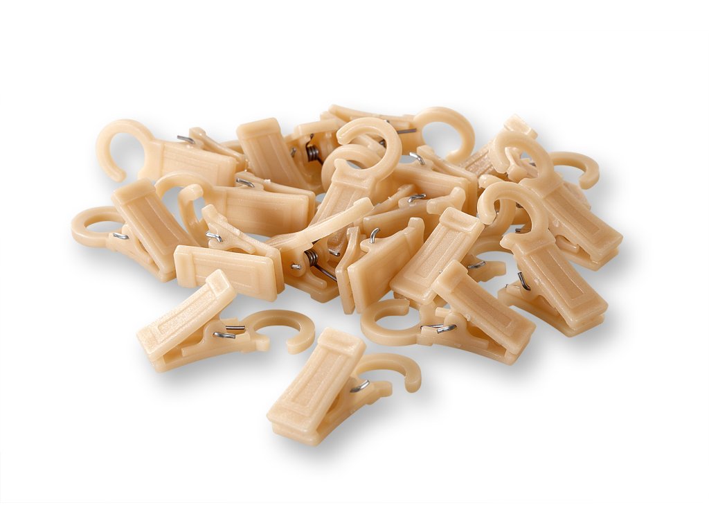 Clipurile pentru perdele din plastic, din fag, sunt concepute pentru a fi utilizate cu inele pentru perdele cu diametrul de 28 mm. Clipsurile sunt prevăzute cu un cârlig care se agăță de inel. Pachetul conține 20 de broaște de plastic în culoarea fagului.