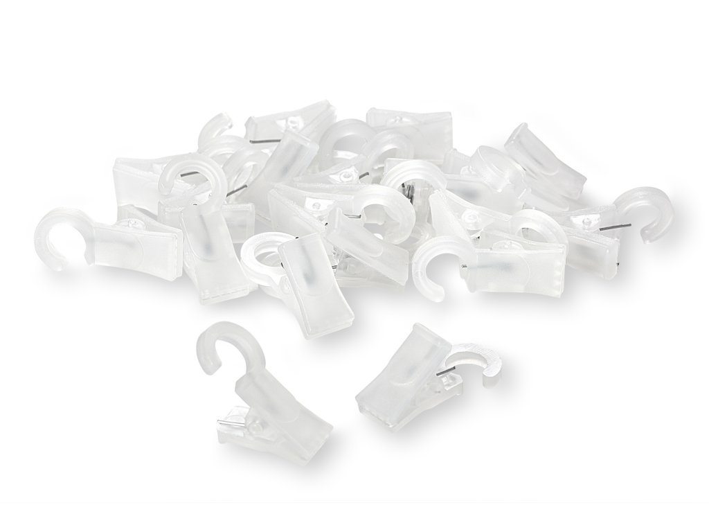 Clipurile pentru perdele din plastic transparent de înaltă calitate sunt concepute pentru a fi utilizate cu inele pentru pelmet cu diametrul de 28 mm. Clipsurile sunt prevăzute cu un cârlig care se agăță de inel. Pachetul conține 20 de flip-flops din plastic transparent.