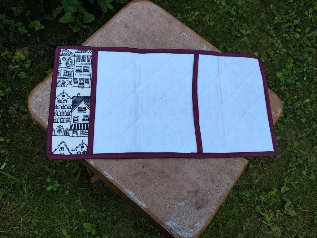Coperta protectoare pentru carte este un accesoriu foarte practic pentru orice iubitor de cărți. Coperta este fabricată din bumbac, cu un motiv de case pe exterior. Partea interioară este întărită cu plastic pentru a ajuta coperta să își păstreze forma. Culoarea cutiei de cărți este albă, cu un motiv de casă negru. Întreaga copertă este cusută și întărită cu o margine violet închis.