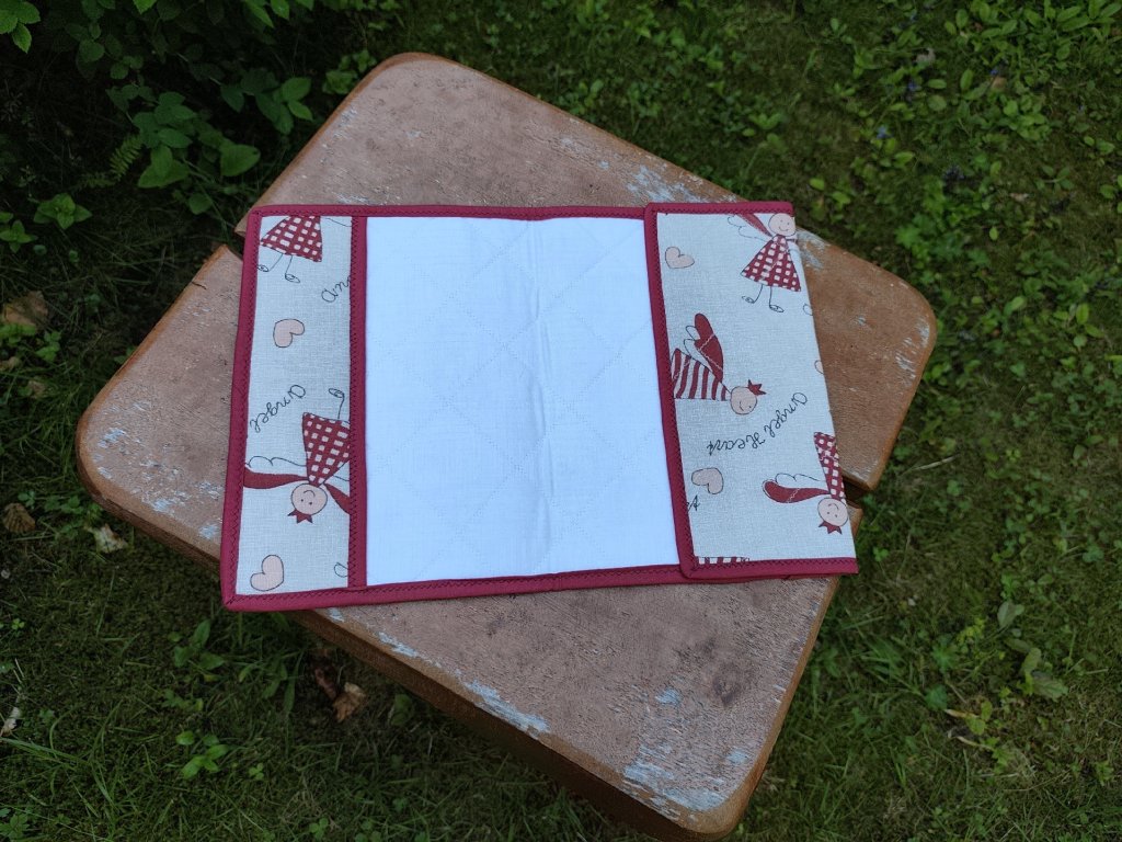 Coperta protectoare pentru carte este un accesoriu foarte practic pentru orice iubitor de cărți. Coperta este fabricată din bumbac gri, cu un motiv de heruvimi fericiți în roșu și alb pe exterior. Partea interioară este întărită cu plastic pentru a-și menține forma. Coperta este împodobită de jur împrejur cu o margine roșie.