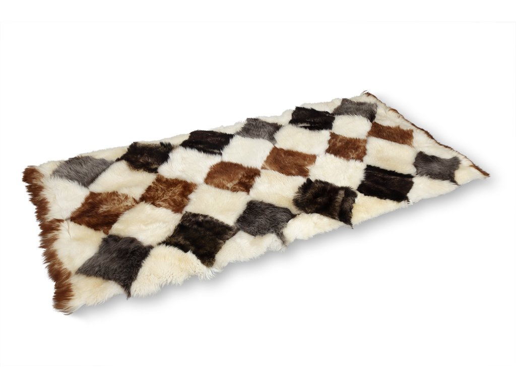 Covoraș decorativ natural, în formă de mic covor, cu dimensiunea de 80 x 175 cm. Covorașul este realizat prin coaserea unor romburi de dimensiuni egale, cu dimensiuni aproximative de 20 x 20 cm. Covorașul este unic datorită designului său inedit. Bucățile de piele sunt cusute manual, ceea ce conferă covorașului o finisare foarte precisă și face ca fiecare piesă să fie originală. Părțile mai scurte ale covorașului sunt finisate cu același decor din păr de oaie, pentru a crea un aspect uniform.