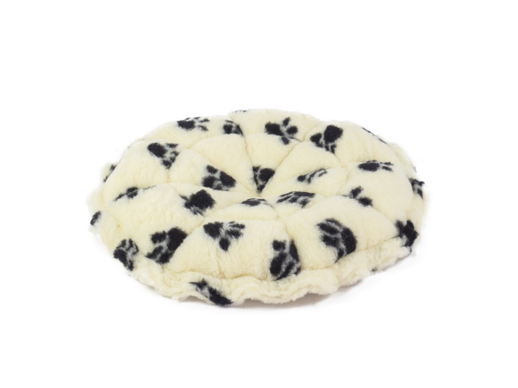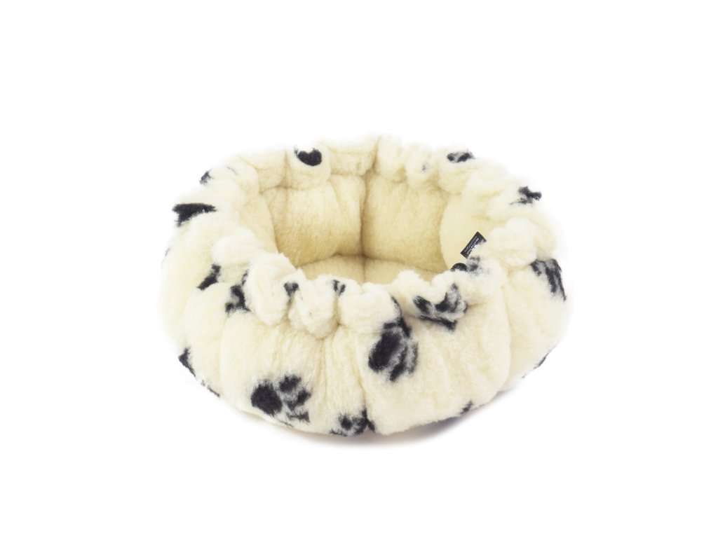 Potrivit pentru: câini mici sau pisici; Material: 100% Merino european (100% lână de oaie); Dimensiunea patului deschis: ∅ 75 cm; Dimensiunea patului închis: ∅ 30 cm; Închidere: cordon cusut în partea de sus; Greutate: 0,70 kg; Culoare: partea interioară galben-crem / partea exterioară galben-crem cu imprimare laba în negru; Greutatea umpluturii interioare: 600g/m2; Greutatea materialului: 450g/m2