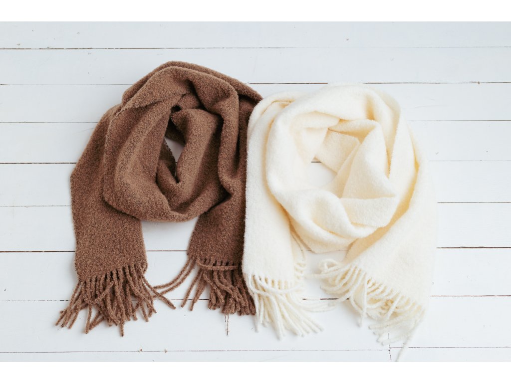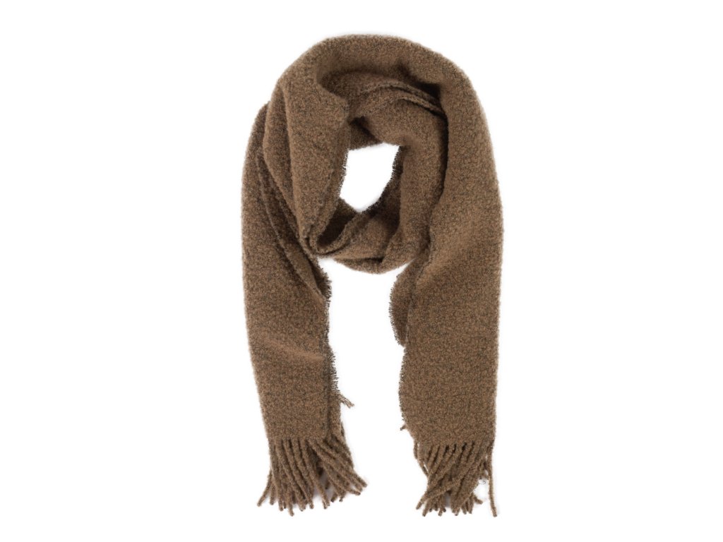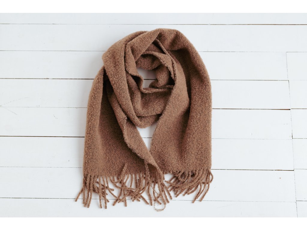 Eșarfa din lână BOUCLE cu franjuri în maro închis este fabricată din lână Merino australiană foarte fină, îmbogățită cu fibre de poliester.
