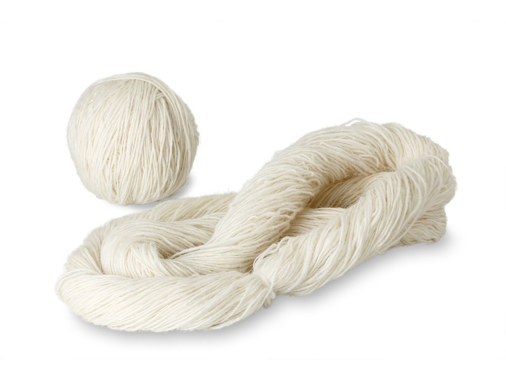Fire de lână în mănunchiuri, alb crem. Toarsă manual, 100% lână de oaie Merino European, vopsită cu coloranți naturali. Lâna și-a păstrat parțial lanolina sa naturală. Potrivit pentru tricotat. Greutatea este de circa 1.000 g, cu o abatere de circa +- 25 g.