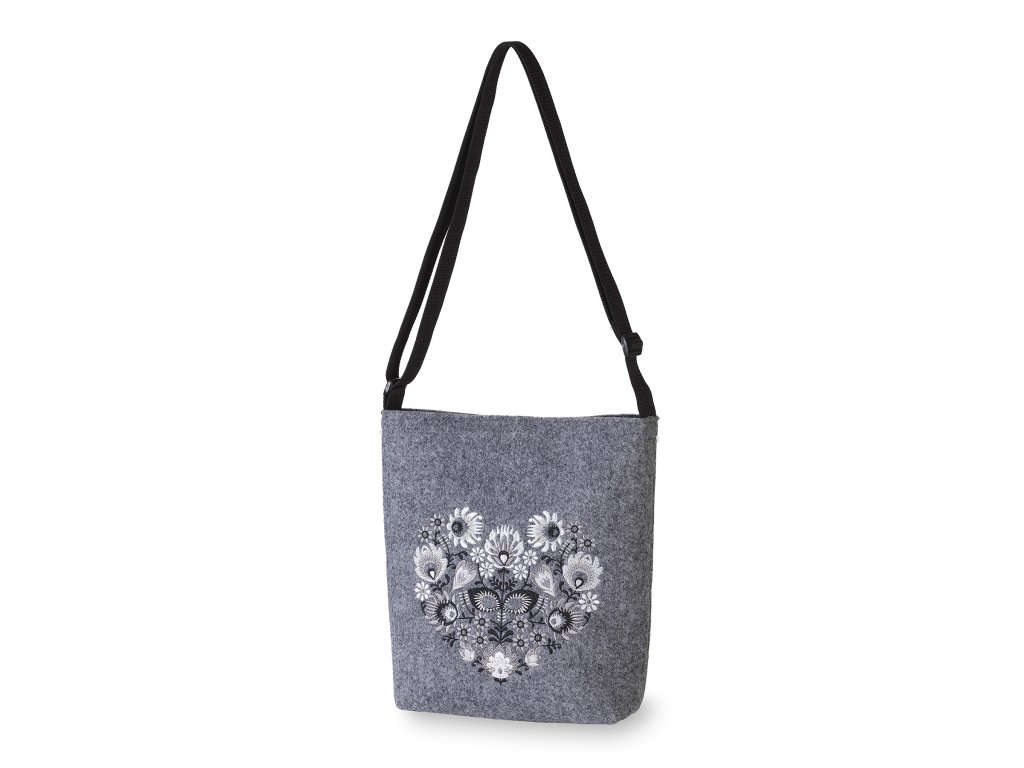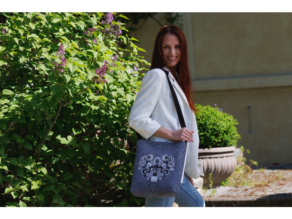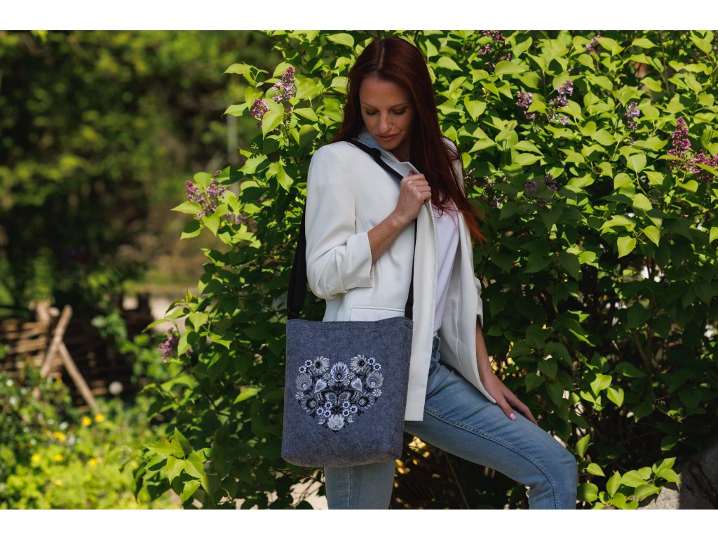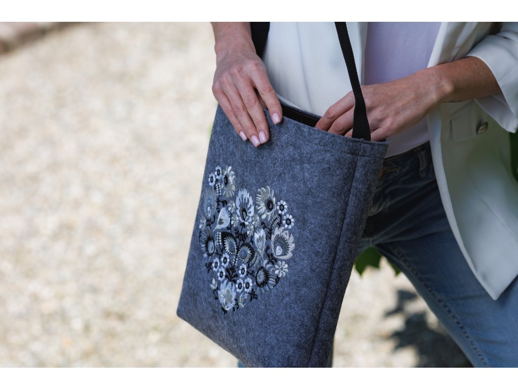 Geantă elegantă din pâslă, în culoare gri deschis. Partea din față a genții are o broderie elegantă în formă de inimă. Broderia este o combinație de flori de pajiște în alb și negru. Datorită utilizării pâslei de înaltă calitate, geanta de mână își păstrează forma. Când este purtat și folosit, nu se deformează și nu se îndoaie. Poate conține formate mai mici decât A4. Gențile din pâslă sunt un accesoriu excelent pentru fiecare femeie căreia îi pasă de eleganță, confort și un sistem clar în geanta sa.