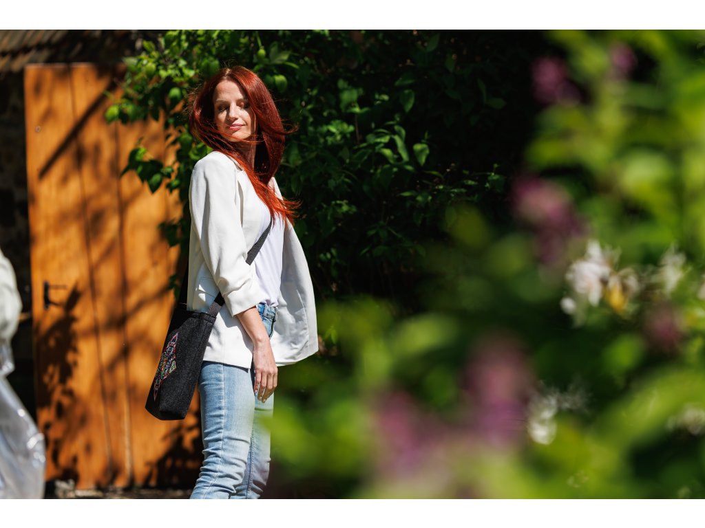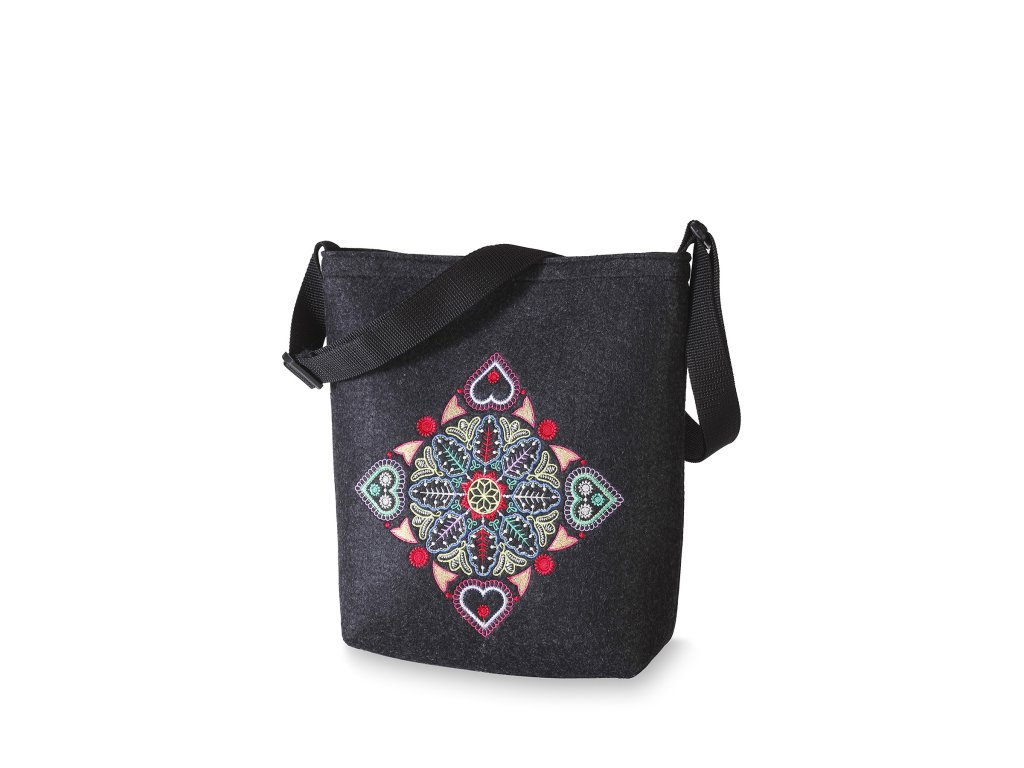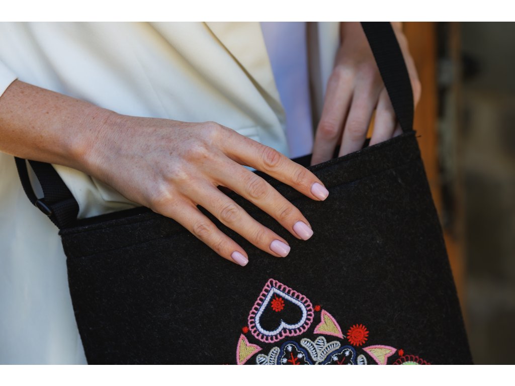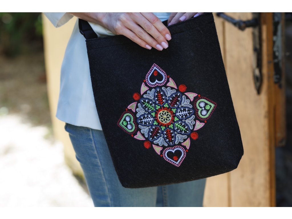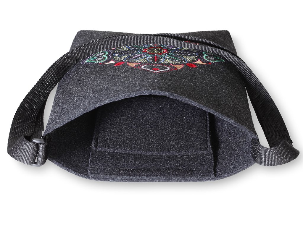 Execuție Culoare: Corpul genții este realizat din pâslă neagră. Partea din față este brodată cu broderie colorată. Dimensiunea motivului de broderie 20 x 20 cm. Cureaua este neagră, suprapunerile din plastic sunt negre.