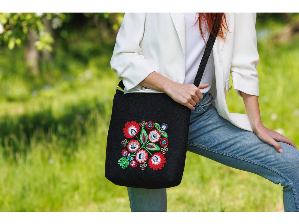 Execuție Culoare: Corpul genții este realizat din pâslă neagră. Partea din față este brodată cu flori colorate. Dimensiunea broderiei este de 20 x 20 cm. Cureaua este neagră, cataramele de pe curea sunt metalice.