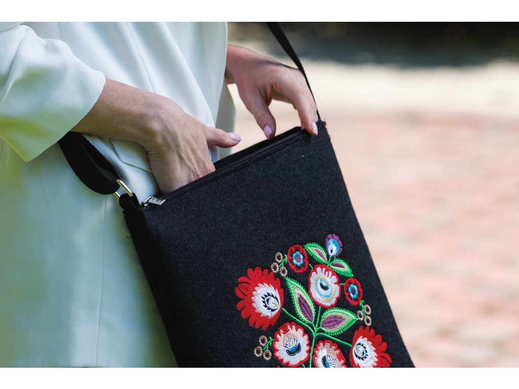 Geanta este fabricată din pâslă neagră. Partea din față a genții este brodată cu flori colorate. Broderia este întotdeauna concepută astfel încât să se asorteze cu nuanța colorată a poșetei și să formeze un ansamblu armonios. Geanta este o combinație între simplitate și funcționalitate. Forma dreptunghiulară alungită permite o purtare și utilizare foarte confortabilă.