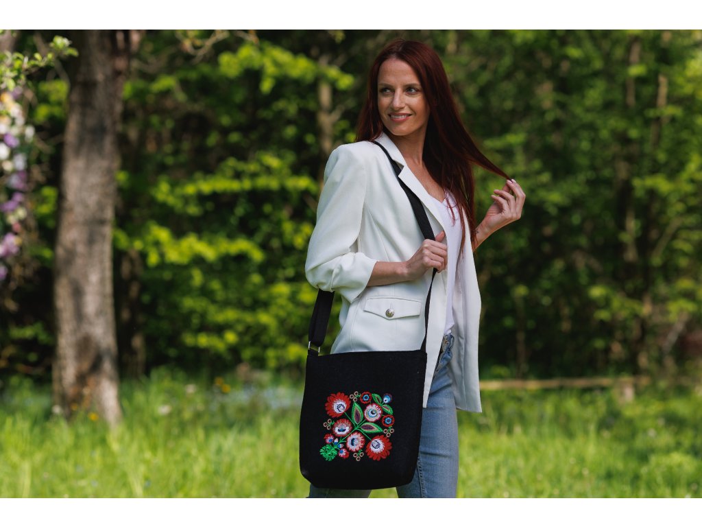Geantă pentru femei, din pâslă, neagră, flori ornamentale colorate