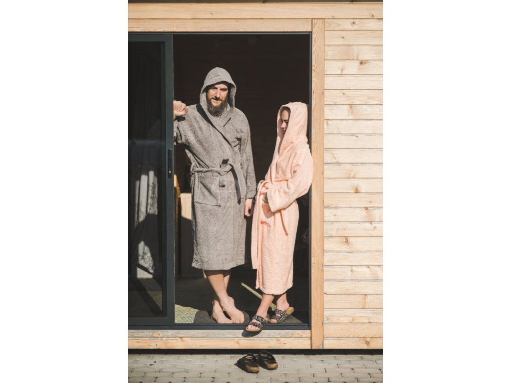 Halatul de saună pentru bărbați este confecționat din 100% bumbac moale, de culoare gri. Acest halat de baie pentru saună este foarte moale, fin și pufos la atingere.
