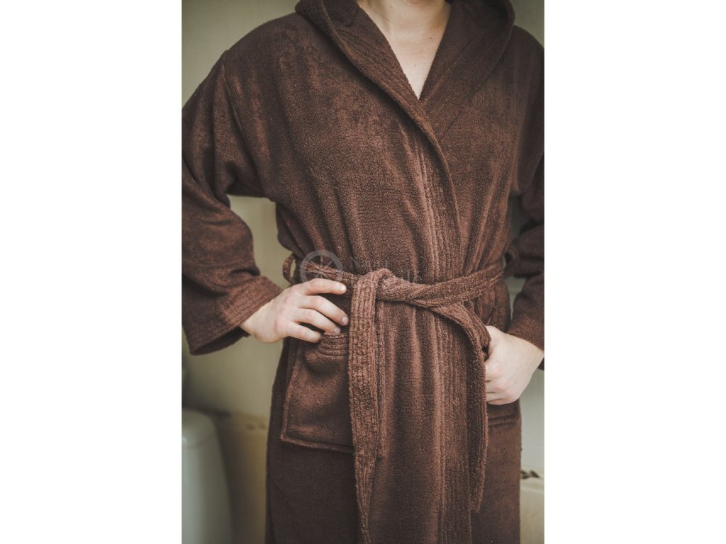 Halatul de saună pentru bărbați este confecționat din 100% bumbac moale, de culoare maro ciocolatiu. Acest halat de baie pentru saună este foarte moale, fin și pufos la atingere.