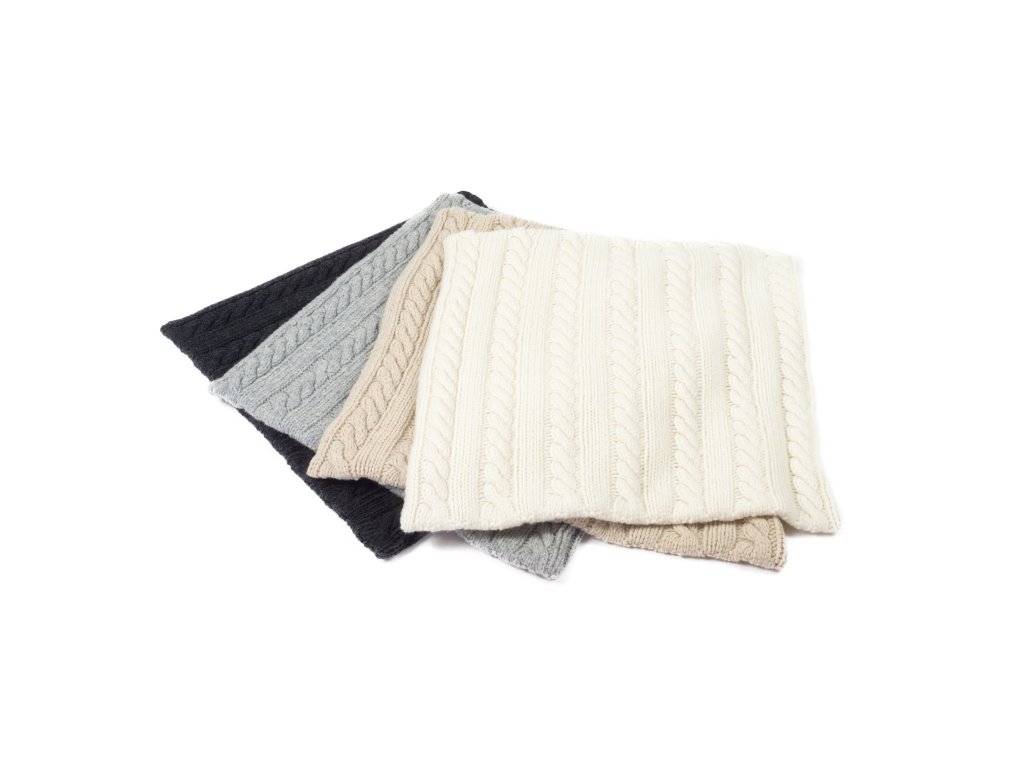 Material de acoperire: 100% Merino australian; Motivul: față-verso: model împletit; Culoare: reversul și fața sunt ecru deschis; Fixare: fermoar metalic; Dimensiune: 45 x 45 cm, Greutate: 0,75 kg, Greutate: 960 g/m2 (1 față este 480 g/m2)
