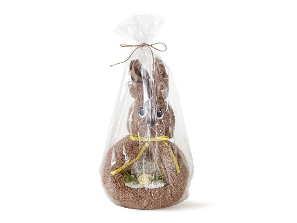 Design: iepuraș așezat cu urechi mari, Material: 100% prosop de terry, Culoarea prosopului: maro, Dimensiunea pachetului: bază 16 x 10 cm, înălțime 30 cm, Greutate: 500g/m2, Dimensiunea prosopului: 50 x 100 cm, Dimensiunea pachetului: 1