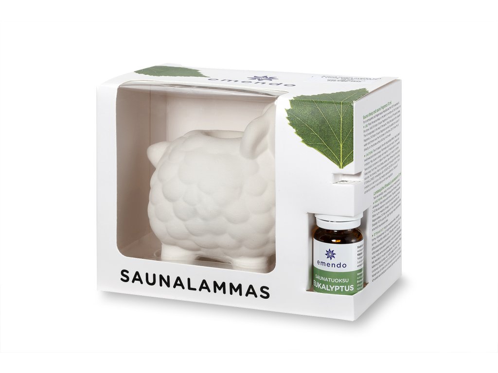 Lampa pentru aromaterapie, în formă de oiță, poate fi așezată, de exemplu, pe banca din saună sau lângă fereastră. Este suficient să picurați 2-6 picături de ulei parfumat în recipientul pentru ulei. Datorită căldurii din saună, uleiul se va evapora treptat, astfel încât spațiul saunei se va umple cu un miros plăcut de eucalipt. Dacă este necesar, puteți turna apă în recipient și apoi se pot adăuga 2-6 picături de ulei parfumat. Vă recomandăm să nu puneți uleiul direct pe pietrele de deasupra.