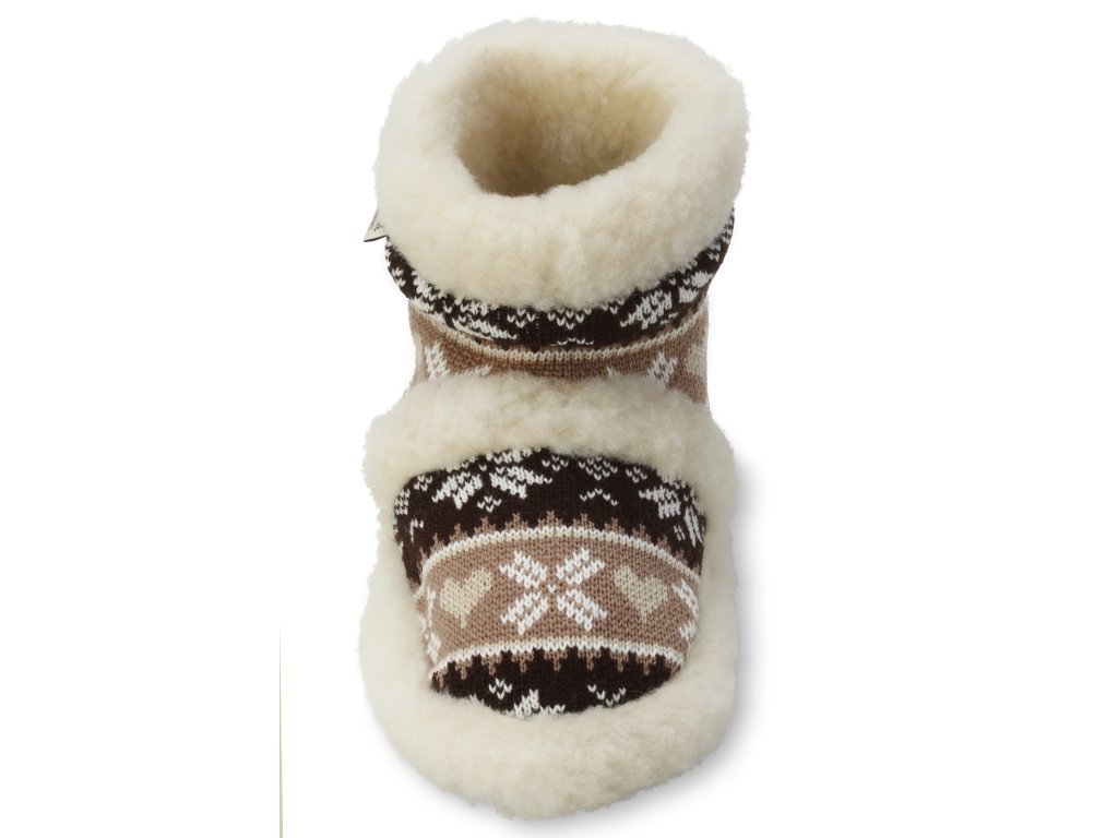 Material: 100% lână de oaie / talpă din plastic antiderapant, Culoare: combinație de motive în culori maro deschis și  maro închis și crem deschis, Mărimi disponibile: 38-45