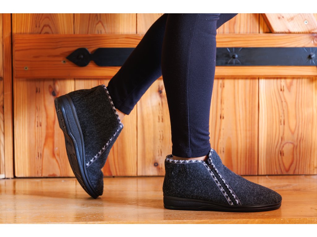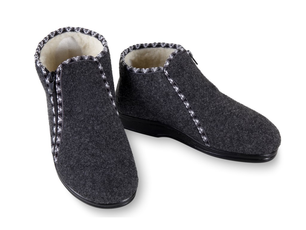 Papucii călduroși pentru femei, în culoare gri închis până la negru, sunt prevăzuți cu un tiv în culoare gri. Închiderea încălțămintei se realizează cu ajutorul unui fermoar situat pe partea laterală. Este vorba despre papuci călduroși, înălțime până la gleznă. Papucii îmblăniți pentru femei, cu lână de oaie, sunt potriviți în special pentru utilizarea în mediul casnic. Produs potrivit și pentru utilizare în exterior, dar mai degrabă în mediul uscat.