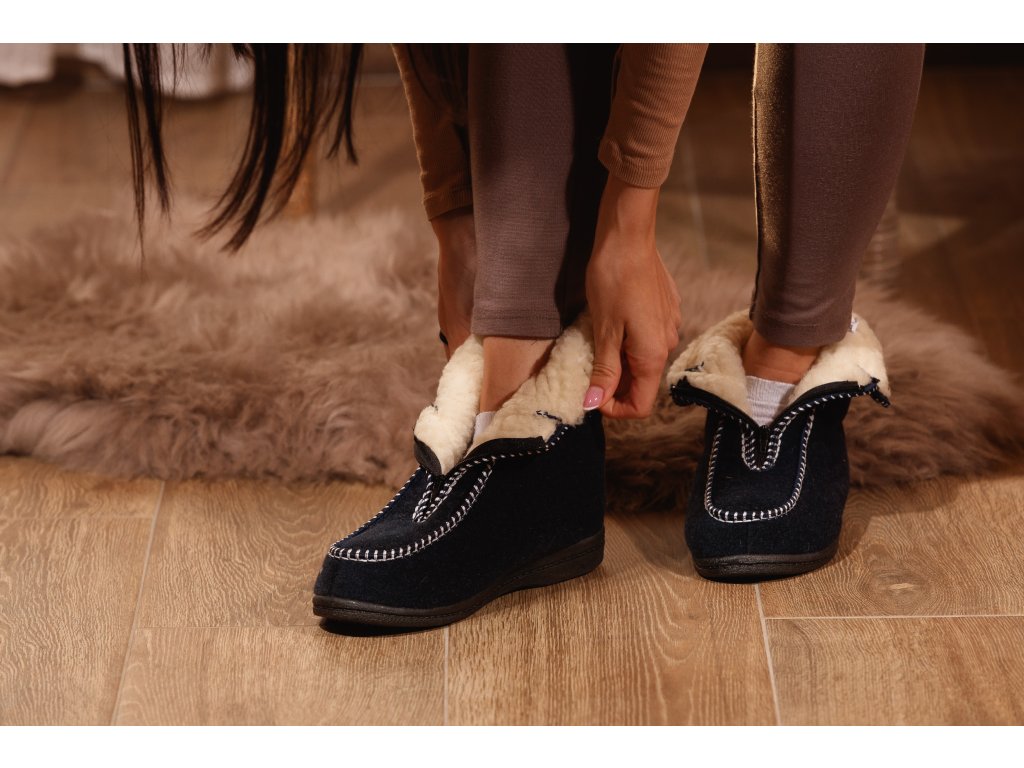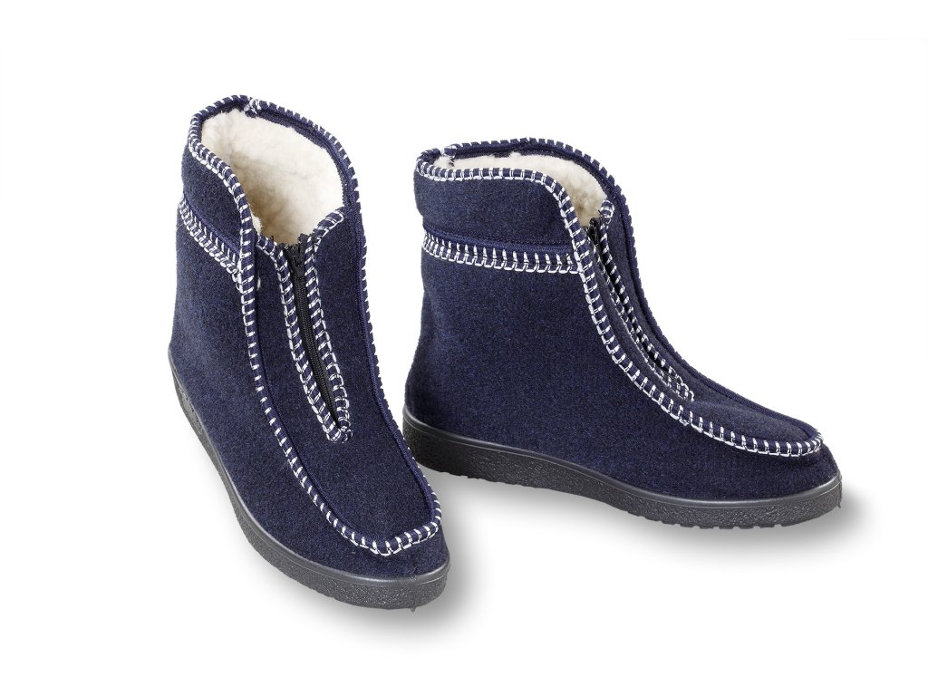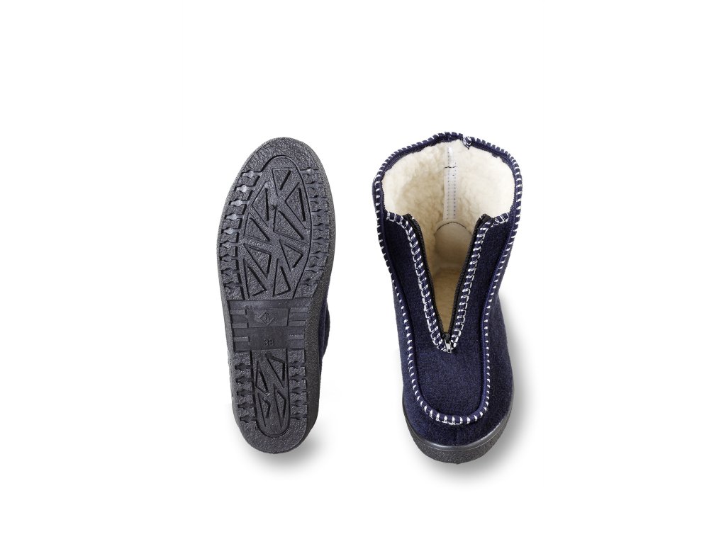 Material: strat exterior din pâslă / strat interior 100% lână de oaie / talpă din plastic antiderapant, Mărimi disponibile: 37-42, Culoare: suprafață exterioară albastru închis, strat interior crem deschis, Talpă: nu este ușoară, cauciuc solid antiderapant