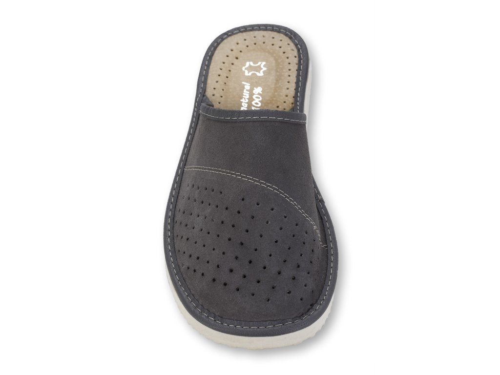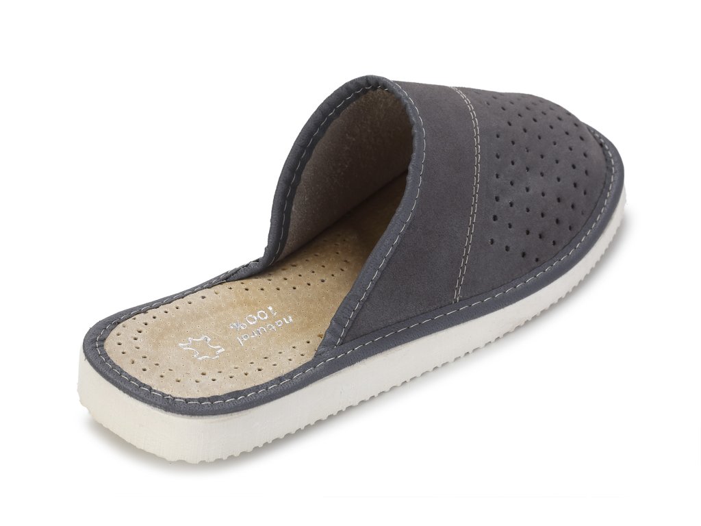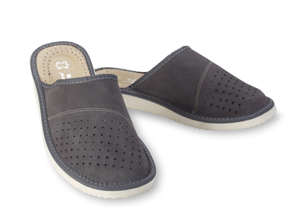 Papucii din piele întoarsă pentru bărbați, de culoare gri închis, sunt destinați utilizării în interior. Papucii din piele sunt ușori pe picior, își păstrează forma chiar și în timpul utilizării, talpa este antiderapantă și nu alunecă.