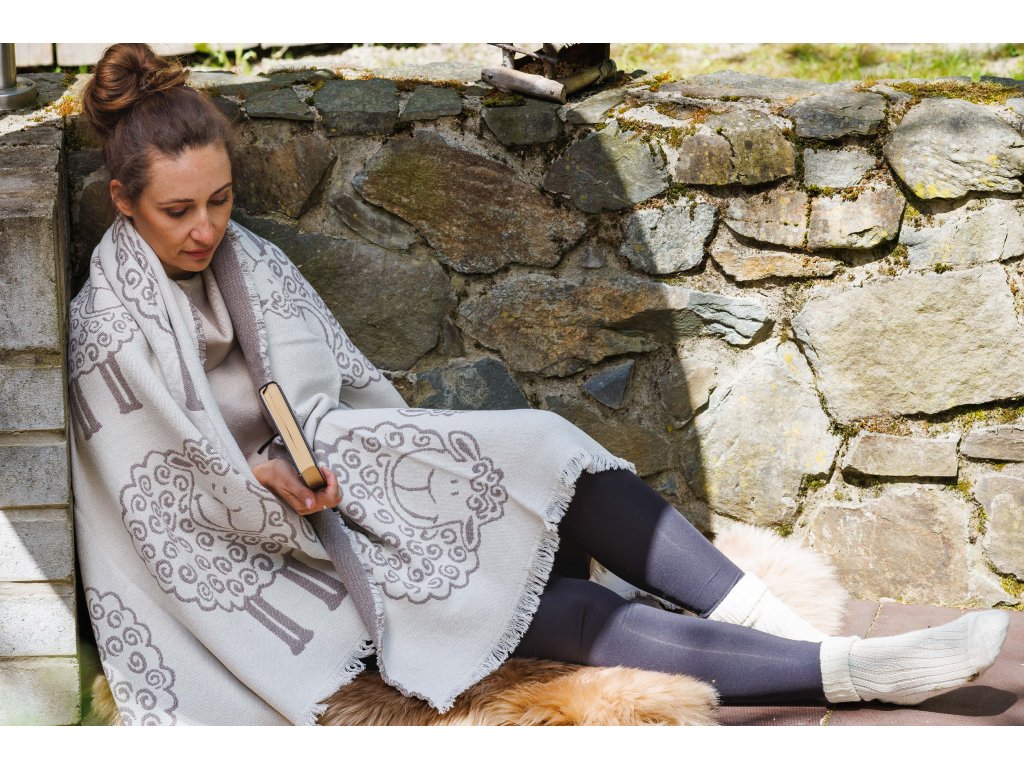 Această pătură călduroasă cu un motiv vesel de oi este fabricată din bumbac 100%. Motivul este dublu, pe o parte a păturii sunt oi fericite în maro pe un fundal alb, pe cealaltă parte sunt oi fericite în alb pe un fundal maro. Vă va încălzi plăcut în fotoliu în timp ce citiți o carte interesantă sau urmăriți un nou episod din serialul preferat.