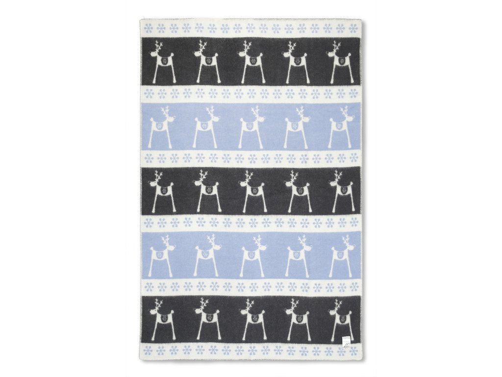 Material: 88% lână de oaie din Noua Zeelandă + 12% bumbac, Dimensiune: 130 x 200 cm, Culoare: albastru-negru, Motiv afișat: ren, Greutate: 1,2 kg, Greutate: 480g/m2