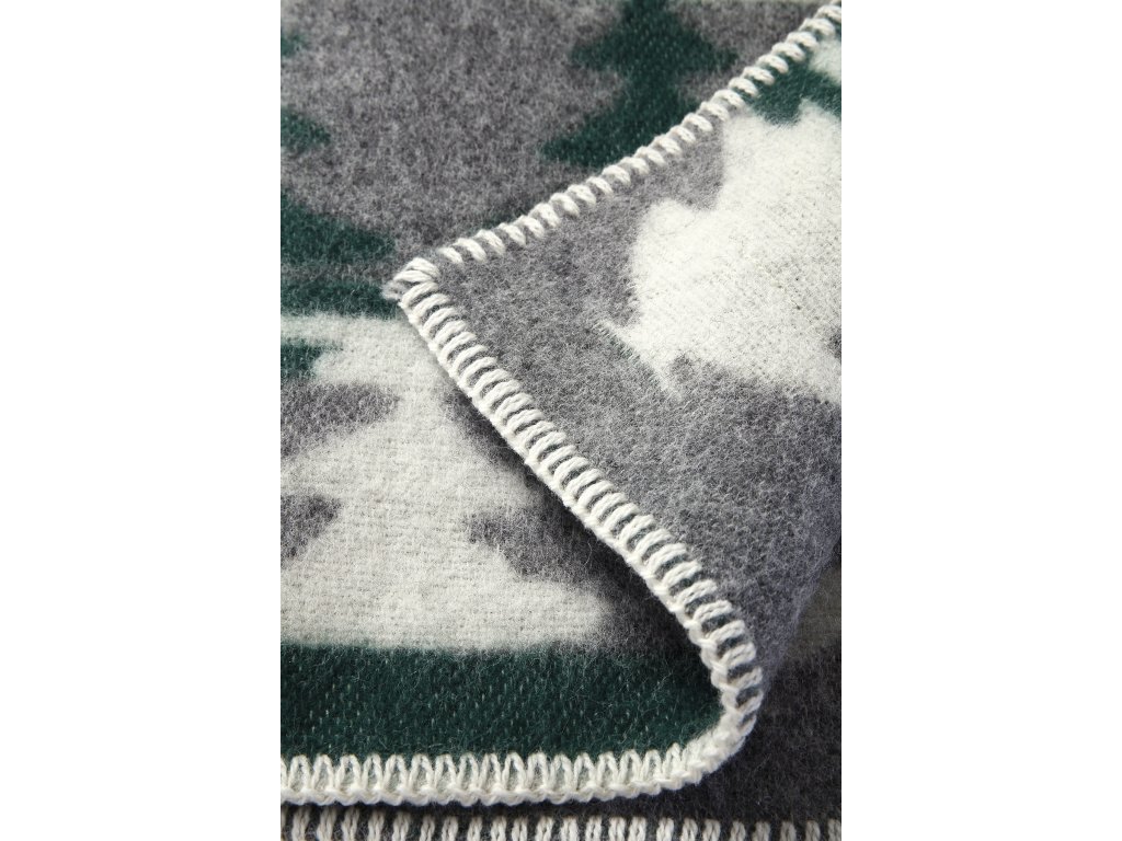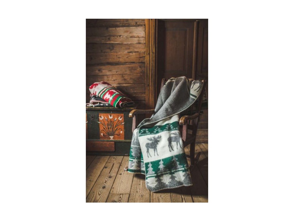 Material: 88% lână de oaie din Noua Zeelandă, 12% bumbac; Dimensiune: 130 x 200 cm, Culoare: gri-verde-alb, Motiv afișat: ren, Greutate: 1,2 kg, Greutate: 480g/m2