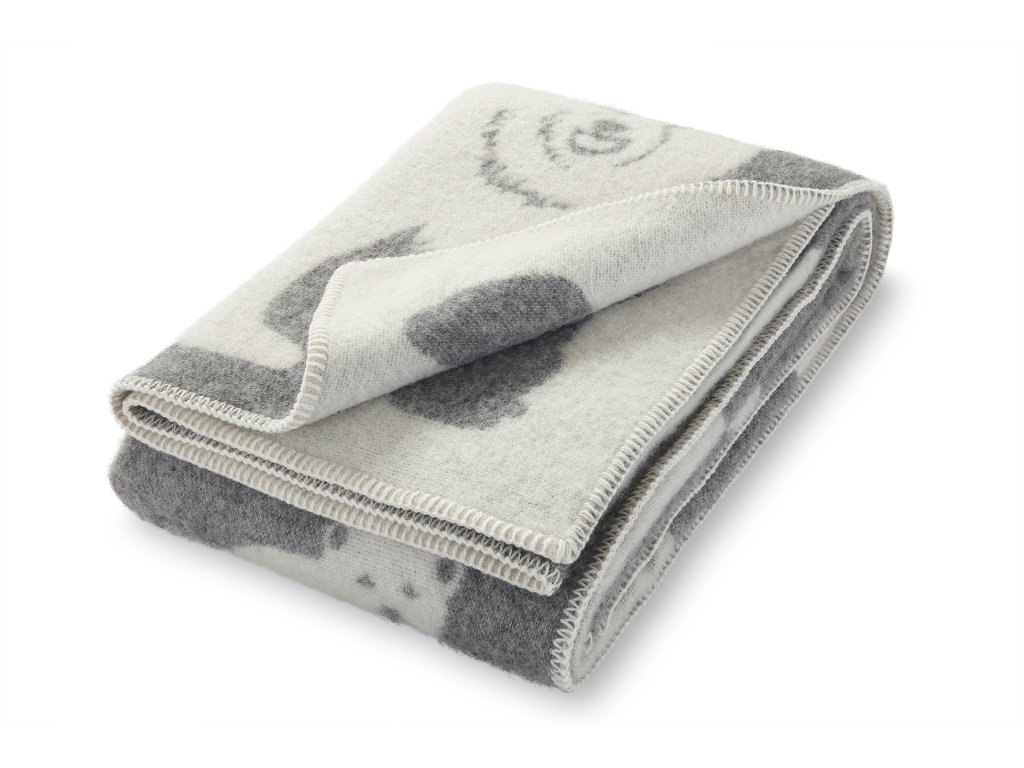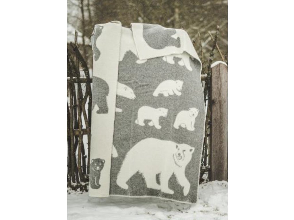 Material: 88% lână de oaie din Noua Zeelandă + 12% bumbac, Dimensiune: 130 x 200 cm, Culoare: gri și alb, Motiv ilustrat: urs polar, Greutate: 1,2 kg, Greutate: 480g/m2