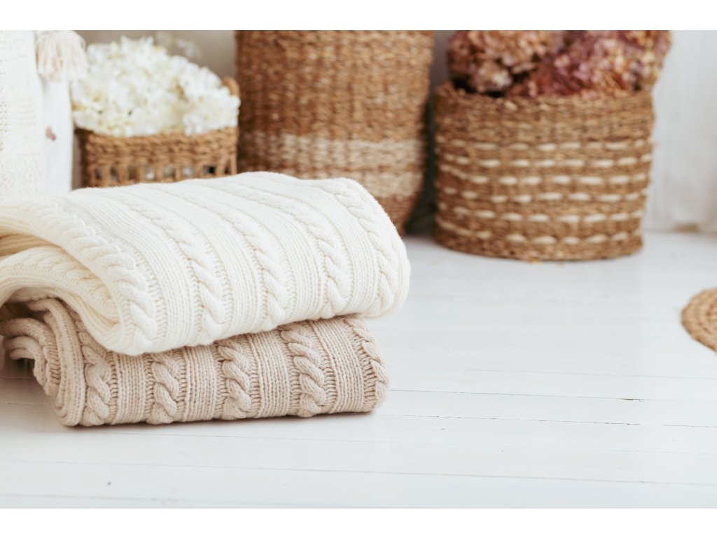 Material: 100% Merino australian;Design: reversibil; Motivul: model regulat împletit; Culoare: ecru deschis pe spate și pe față; Dimensiune: 130 x 170 cm, Greutate: 1.2 kg, Greutate: 550g/m2