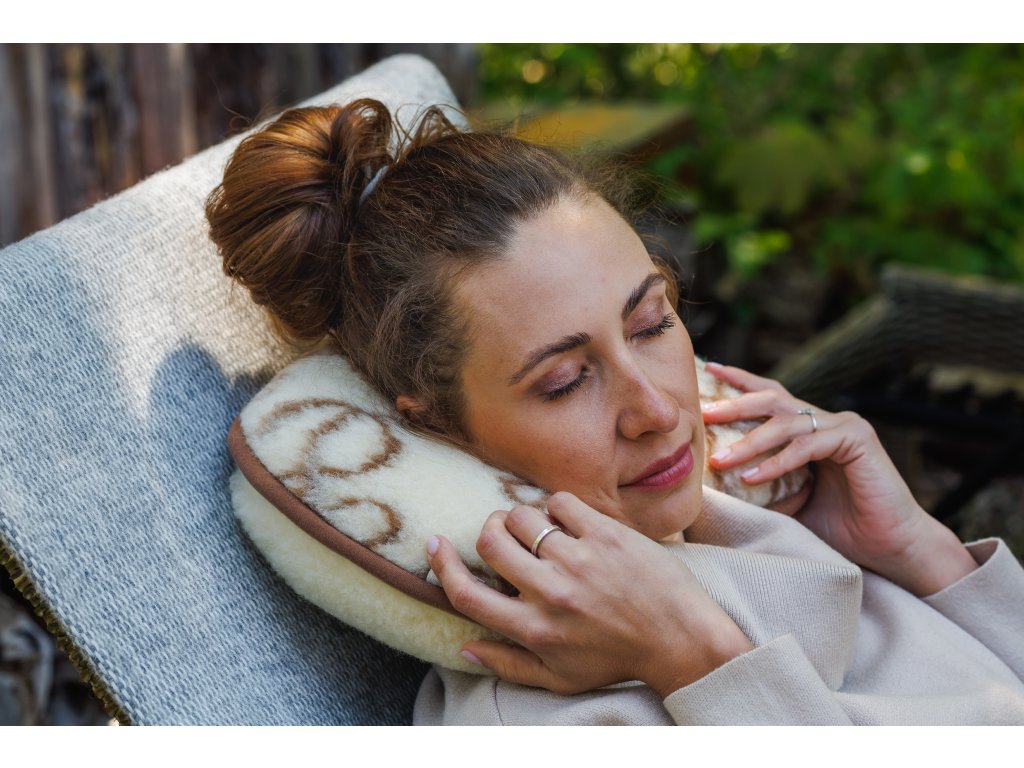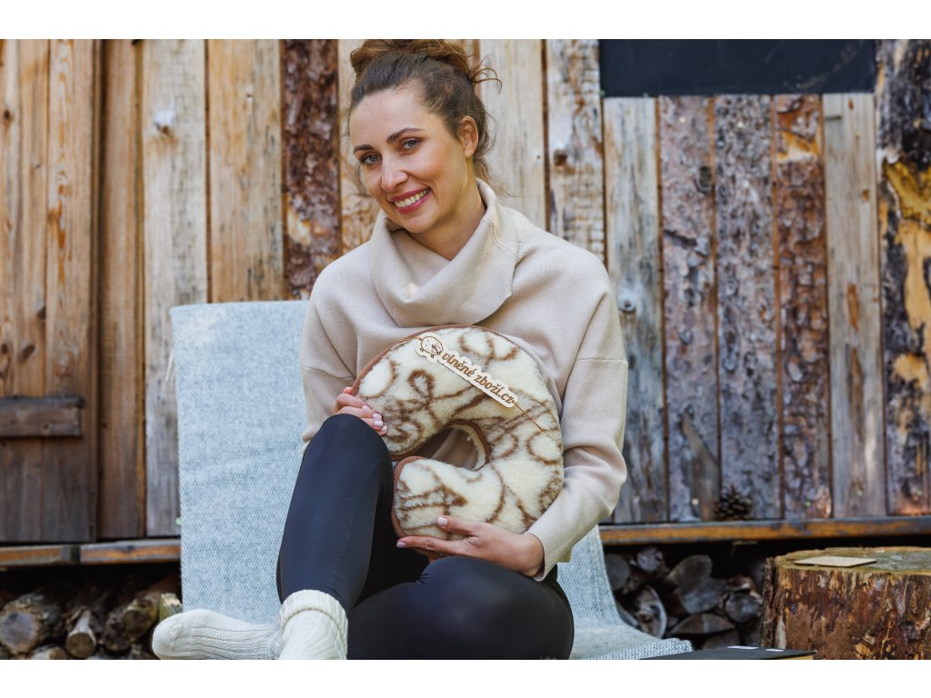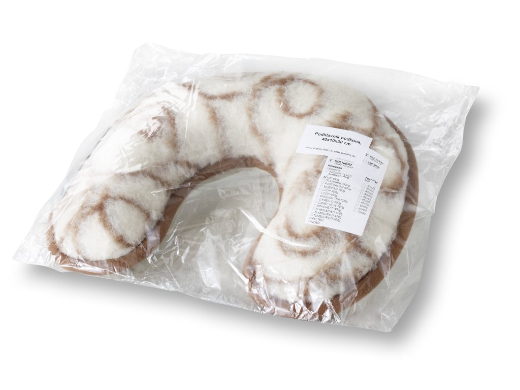 Perna din lână, în formă de potcoavă, este fabricată din 100% lână de oaie. Suprafața pernei este moale și plăcută la atingere.Umplutura constă din bile de silicon combinate cu bucăți de spumă cu memorie. Astfel, produsul este foarte elastic și flexibil. Umplutura interioară nu poate fi îndepărtată. Dimensiunea tetierei este de 40 x 10 x 30 cm.