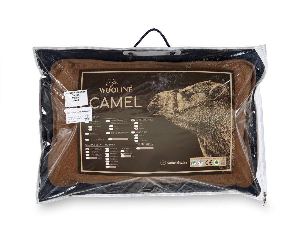 Această pernă unică de 40 x 60 cm cu două fețe și păr de cămilă (lână) este ideală pentru toate persoanele care doresc să adoarmă și să doarmă aproape ca într-o pernă de bumbac. Suprafața pernei este foarte moale și va fi apreciată de iubitorii de eleganță simplă și, în special, de confortul în timpul odihnei. Pentru fabricarea husei de pernă s-au utilizat două tipuri de lână. Cea mai fină lână cu denumirea de Merino Australian, îmbogățită cu fibre de păr de cămilă. Proporțional, materialul utilizat este compus din 95% din cea mai fină lână cunoscută sub denumirea Merino Australian + 5% lână de cămilă.