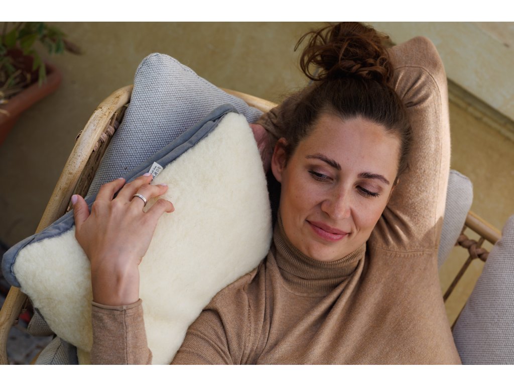 Pernă decorativă fabricată din 100% lână Merino Europeană. Partea din față are o culoare crem deschisă. Lâna este moale și foarte delicată la atingere. Partea din spate este gri, cu un motiv cu pene. Perna este prevăzută cu o margine întărită în gri.
