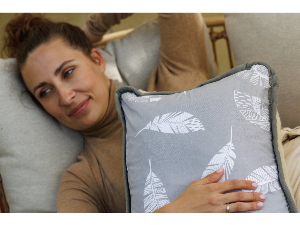 Perna decorativă de 40 x 45 cm are o parte inversă gri cu motive de pene albe, iar partea inversă este crem deschis. Umplerea pernei este realizată din bile de silicon, poate fi îndepărtată și spălată separat. Partea laterală a pernei Merino este prevăzută cu un fermoar metalic pentru o mai bună manipulare.