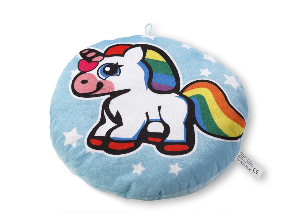Perna moale de pluș cu imaginea unicornului popular în albastru este un accesoriu indispensabil pentru camera fiecărui copil. Perna este potrivită pentru persoanele alergice, copii de la 0 ani și adulți. Fă-ți copiii fericiți cu această pernă cu un unicorn pe cale să decoleze.