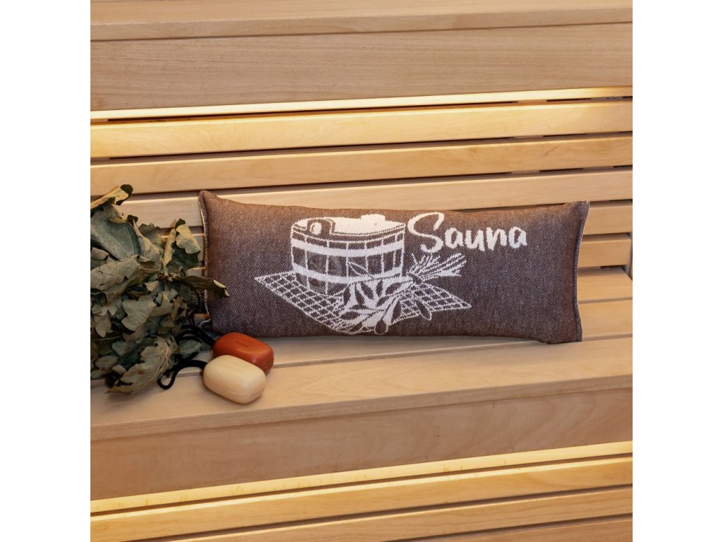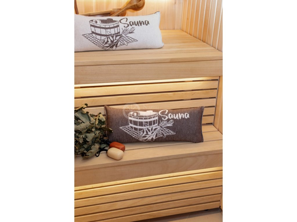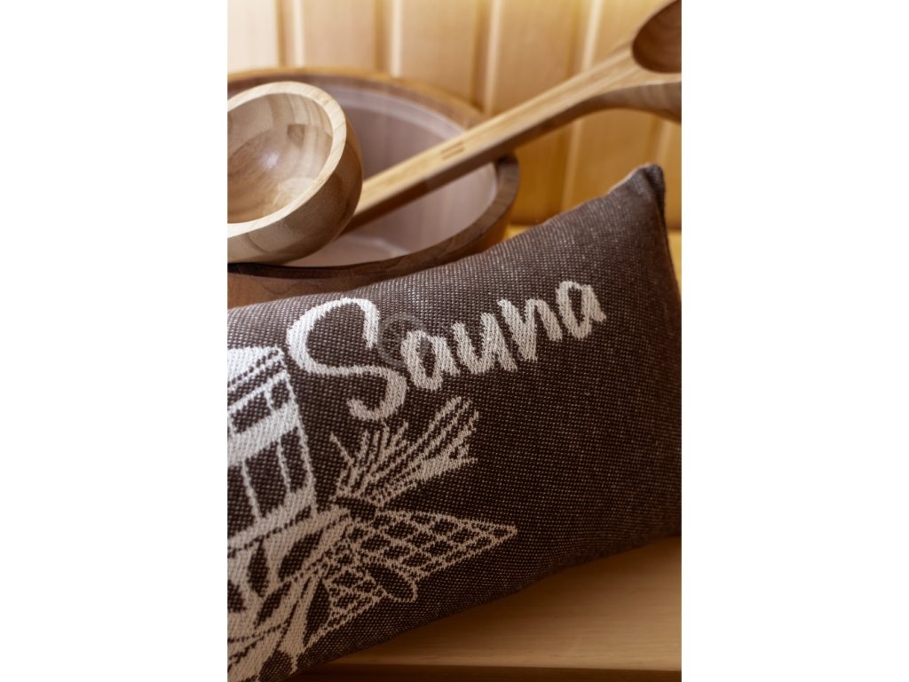 Perna pentru saună vă oferă un confort sporit pentru cap în timpul petrecut în saună. Dimensiunea pernei din bumbac este de 50 x 22 cm. Motivul imprimat pe pernă este pe ambele părți. Fiecare parte a pernei are o nuanță diferită. Reversul este maro închis, cu o imagine și un text în crem deschis. Fața pernei are un fundal crem deschis cu un motiv și un text maro închis.