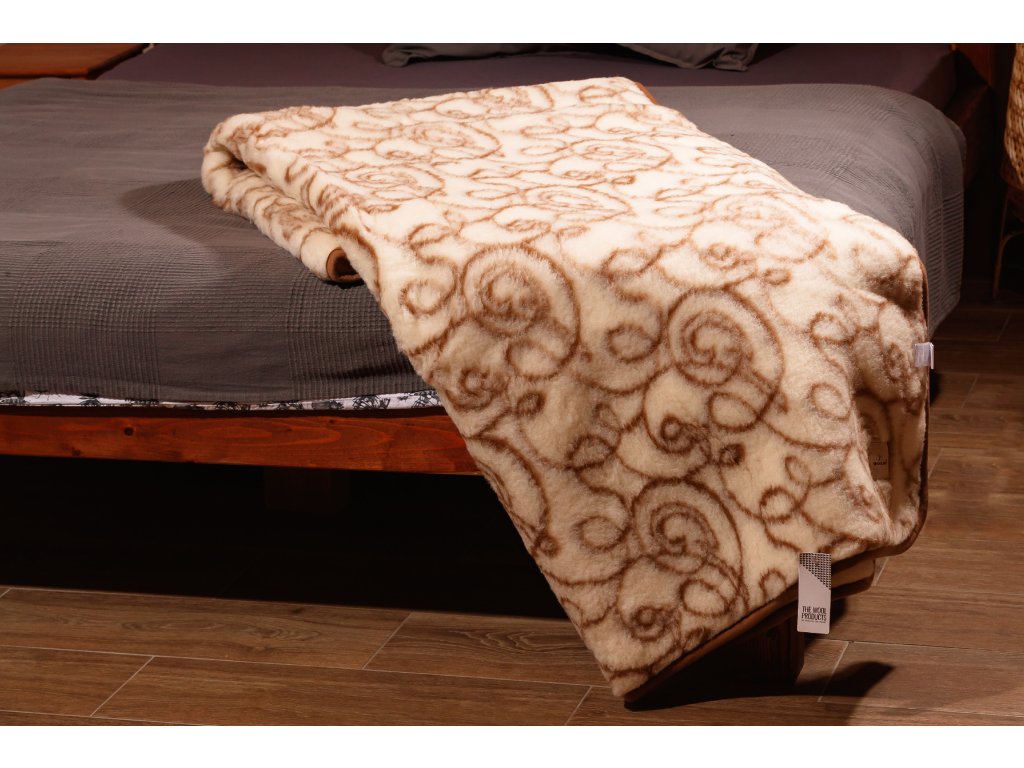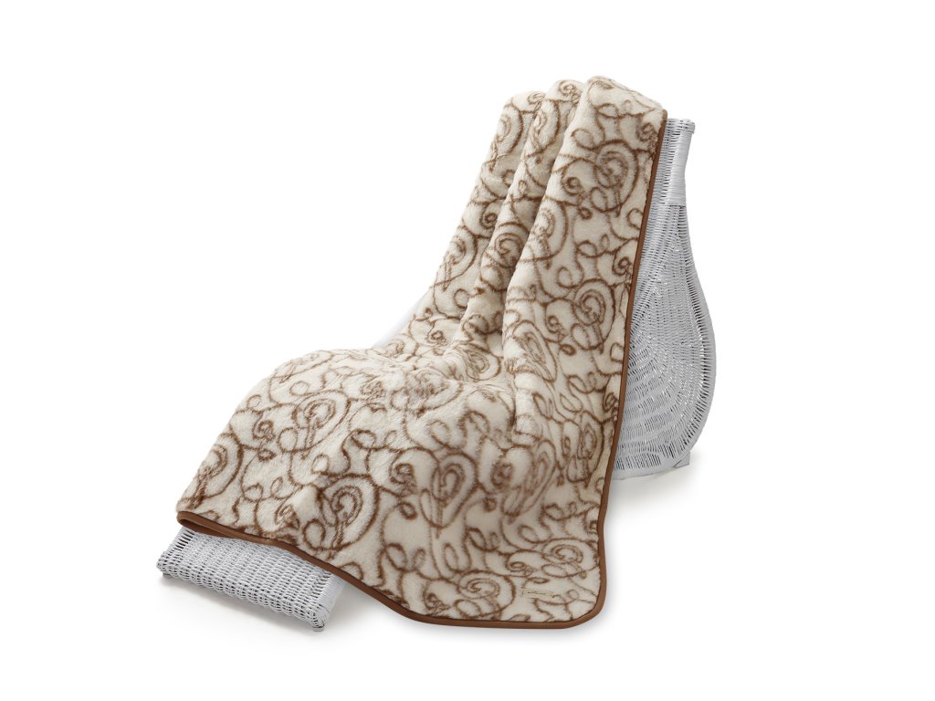 Material: 100% Merino European (100% lână de oaie), Execuție: din două fețe - partea interioară este imprimată cu un motiv, partea exterioară este într-o singură culoare, crem deschis, Dimensiune: 135 x 200 cm, Greutate: 2,4 kg, Gramaj: 2 x 400g/m2