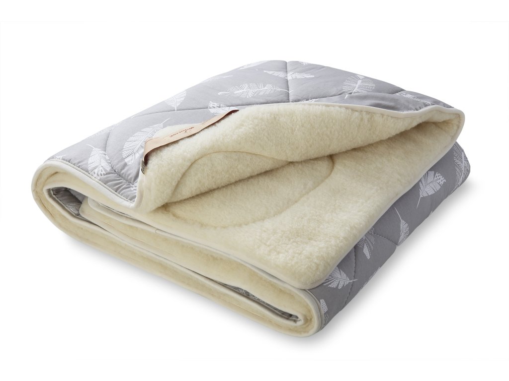 Material: 100% lână Merino europeană / 100% bumbac cu imprimeu, Design: față-verso - verso cu fundal gri cu motive de pene albe, fața este de culoare solidă în crem deschis, Dimensiune: 140 x 200 cm, Greutate: 2,5kg, Greutate: 450g/m2