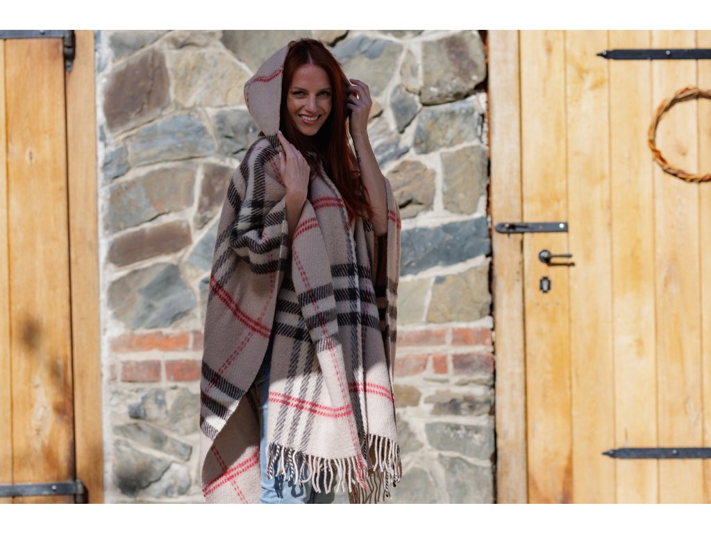 Schema de culori a poncho-ului este maro deschis cu roșu și negru într-un model în carouri, se închide în față cu nasturi pe toată lungimea și are o glugă practică și elegantă. Poncho-ul este căptușit cu franjuri moderne în jurul circumferinței inferioare, cu o lungime de aprox. 8 cm.