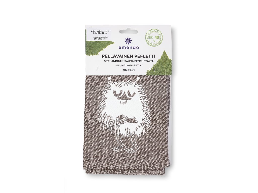 Material: 60% in, 40% bumbac reciclat, Dimensiune: 40 x 50 cm, Culoare: maro, Motivul: Stinky; Utilizare: covoraș pentru saună, Greutatea materialului: 250g/m2, Potrivit pentru utilizare: copii, adulți