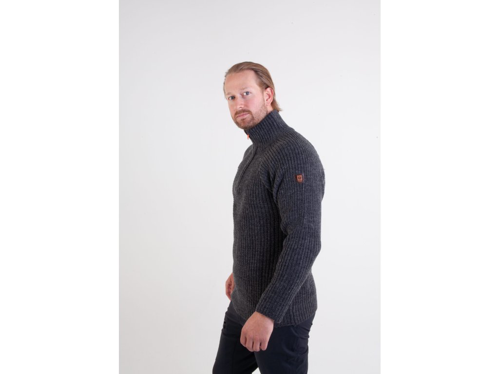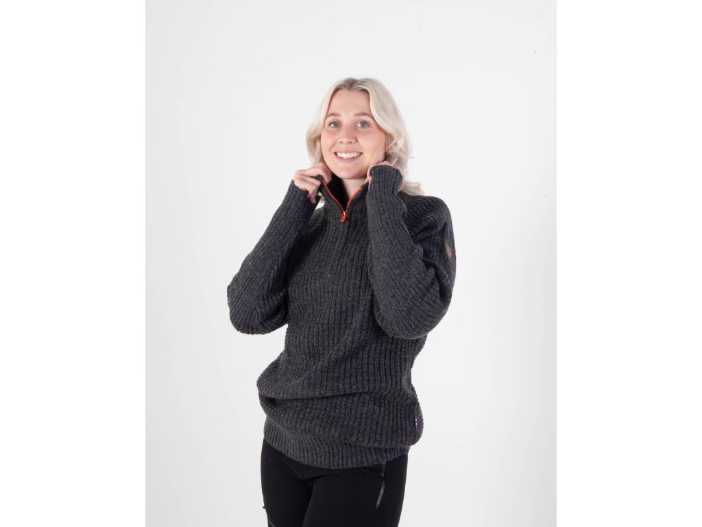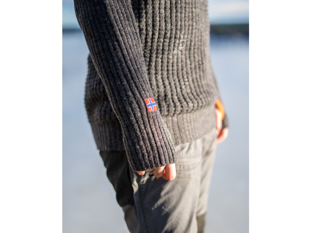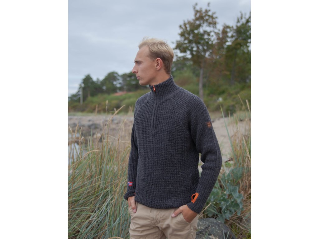 Puloverul funcțional merino este destinat atât femeilor, cât și bărbaților. Puloverele norvegiene sunt cunoscute pentru caracterul lor universal și sunt fabricate în variantă unisex. Motivul colorat al puloverului constă în baza de culoare gri combinată cu elemente portocalii. Puloverul funcțional este prevăzut cu un guler înalt, care acoperă foarte bine zona problematică a gâtului împotriva frigului. Puloverul este prevăzut cu un fermoar din plastic cu lungimea de aproximativ 25 cm. O „caracteristică” practică sunt orificiile pentru degete, amplasate la capetele mânecilor.