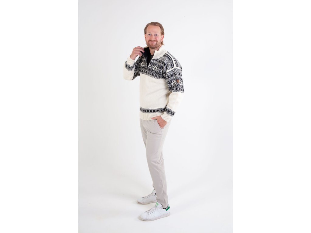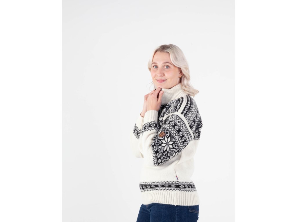 Puloverul din lână STJERNE este destinat atât femeilor, cât și bărbaților. Puloverele norvegiene sunt cunoscute pentru caracterul lor universal și sunt fabricate în variantă unisex. Motivul colorat al puloverului constă în baza de culoare alb crem. În zona pieptului, a capetelor mânecilor și a tivului din talie, puloverul are imprimat un motiv de trandafir cu opt petale, de culoare neagră. Datorită combinației de culori alb și negru, acest pulover de iarnă conferă un aspect atemporal și elegant. Puloverul de iarnă este prevăzut cu un guler înalt de aproximativ 8 cm. Gulerul înalt este confecționat din fleece pe interior și din lână pe exterior. Datorită combinației de fleece și lână, puloverul asigură o senzație plăcută de căldură în zona gâtului. Gulerul înalt este prevăzut cu un fermoar din plastic, astfel încât puloverul poate fi desfăcut.